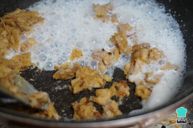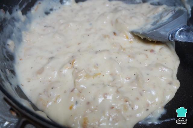Cocina la masa hasta que quede una crema espesa. La cantidad de leche puede variar, por eso es mejor añadirla poco a poco y conforme sea necesario. Espolvorea un poco de sal, prueba y agrega un poco más si lo consideras oportuno. Como lleva especias, no hará falta añadir mucha sal y tampoco ninguna especia.