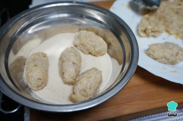 Ponla masa de las croquetas de Heura en una fuente y deja que se enfríe. Cuando esté fría, métela en la nevera y deja que repose durante 1 hora o de un día para otro.