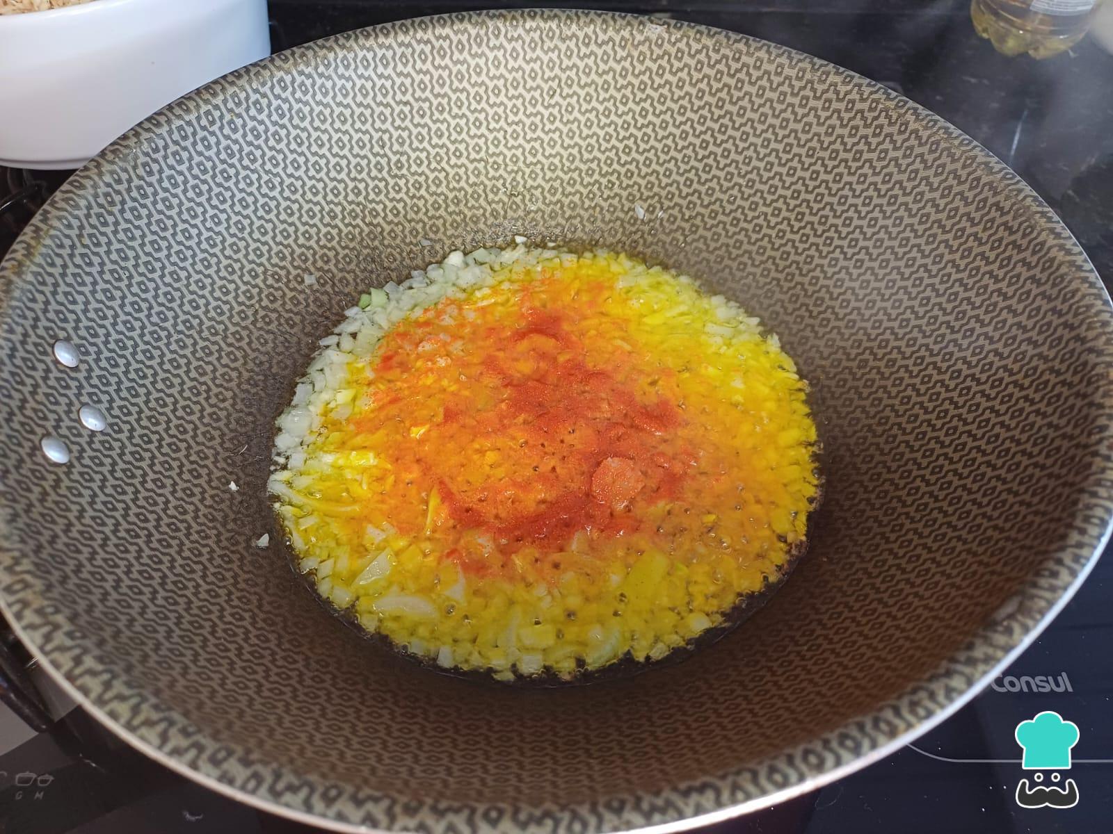 En una sartén, calienta aceite de oliva a fuego medio y sofríe la cebolla, el ajo y el pimentón hasta que estén dorados.