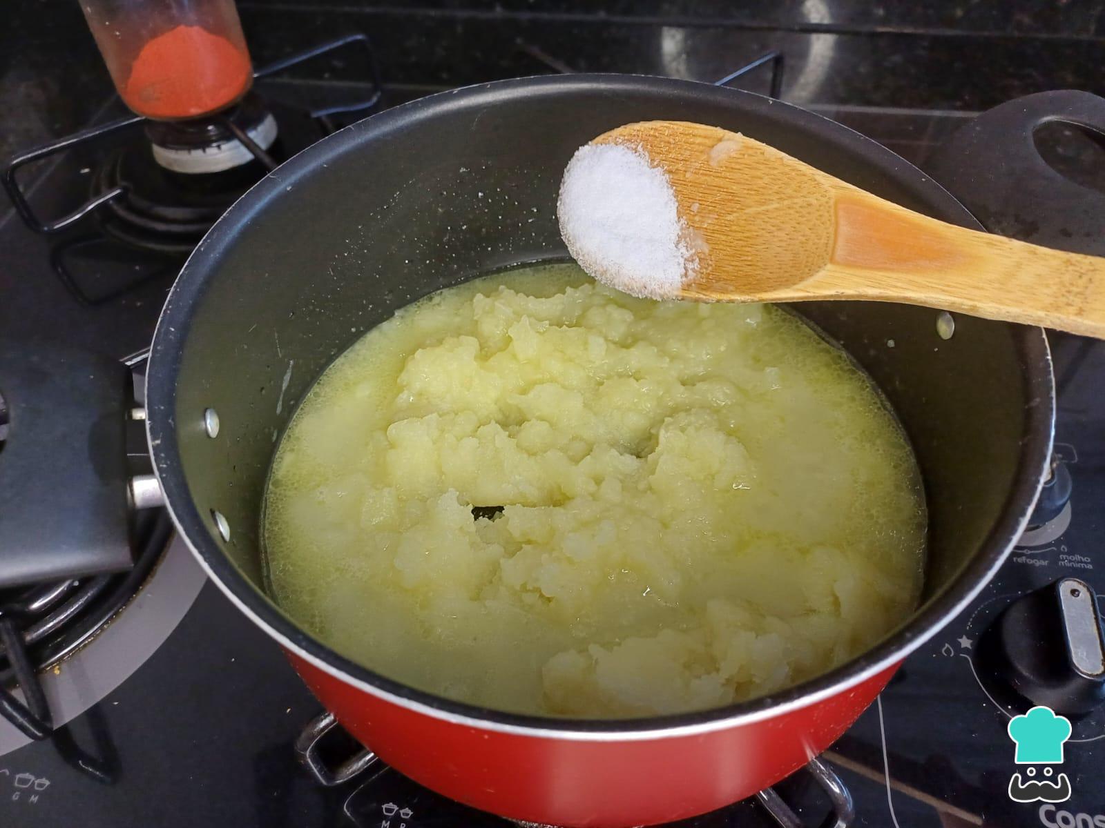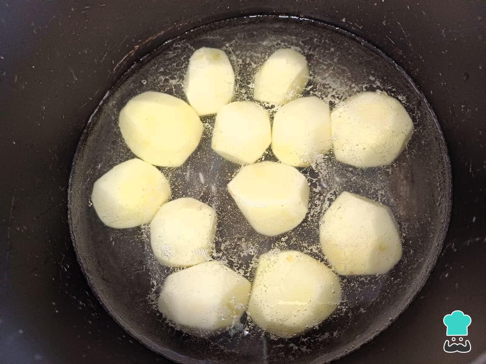 Cuece las patatas sin piel, cubiertas con agua y una pizca de sal durante 10 minutos, o hasta que estén blandas. Apaga el fuego, desecha el agua y tritura las patatas con un tenedor formando un puré.