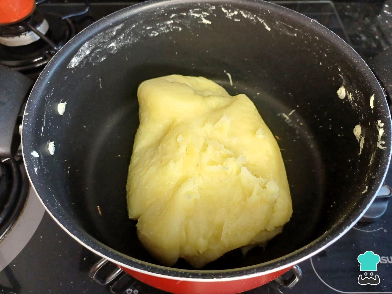 Añade poco a poco la harina de trigo, revolviendo constantemente hasta formar una masa homogénea que se desprenda de la sartén. Apaga el fuego y espera a que la masa se enfríe.