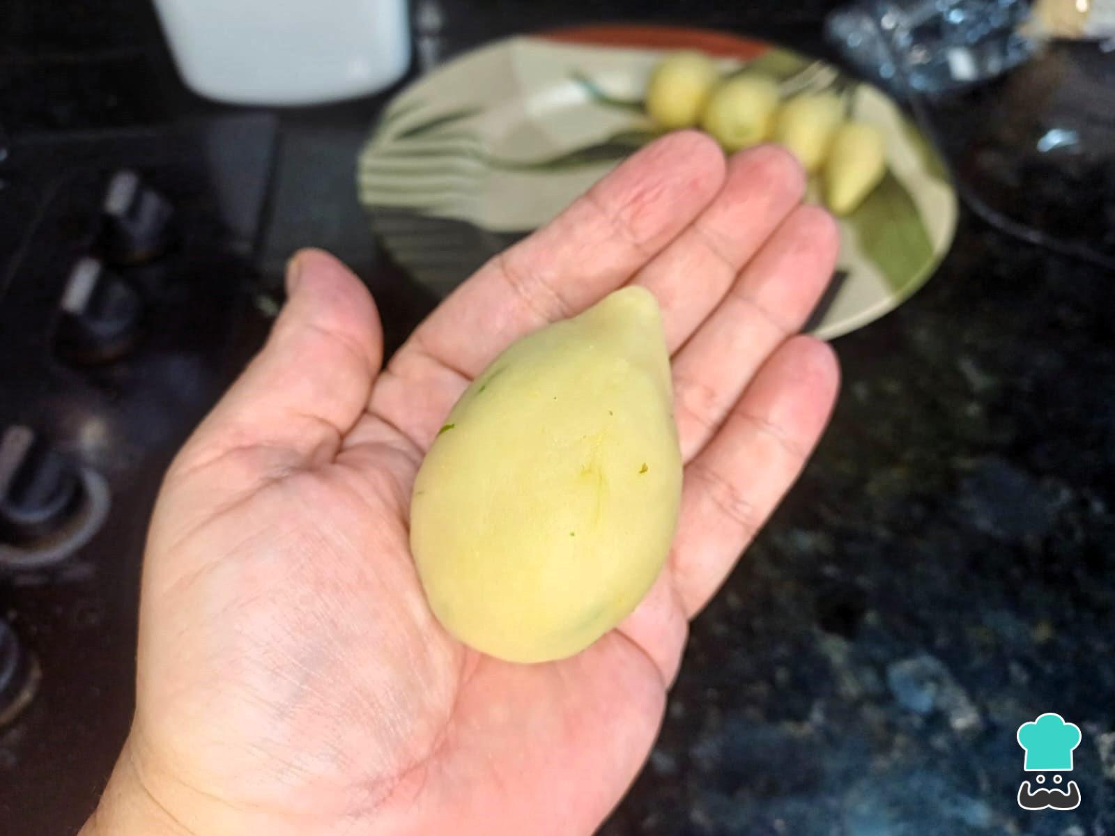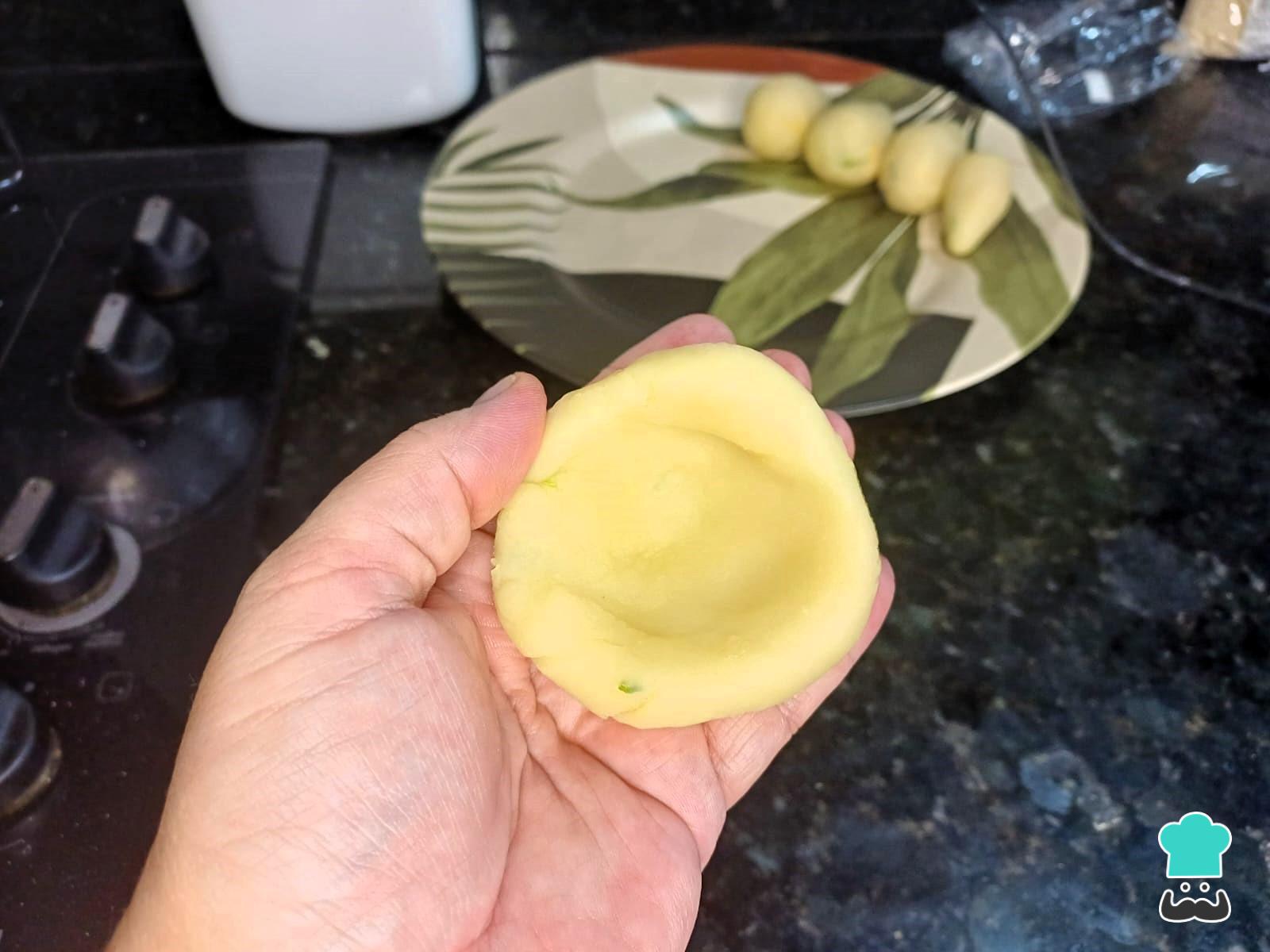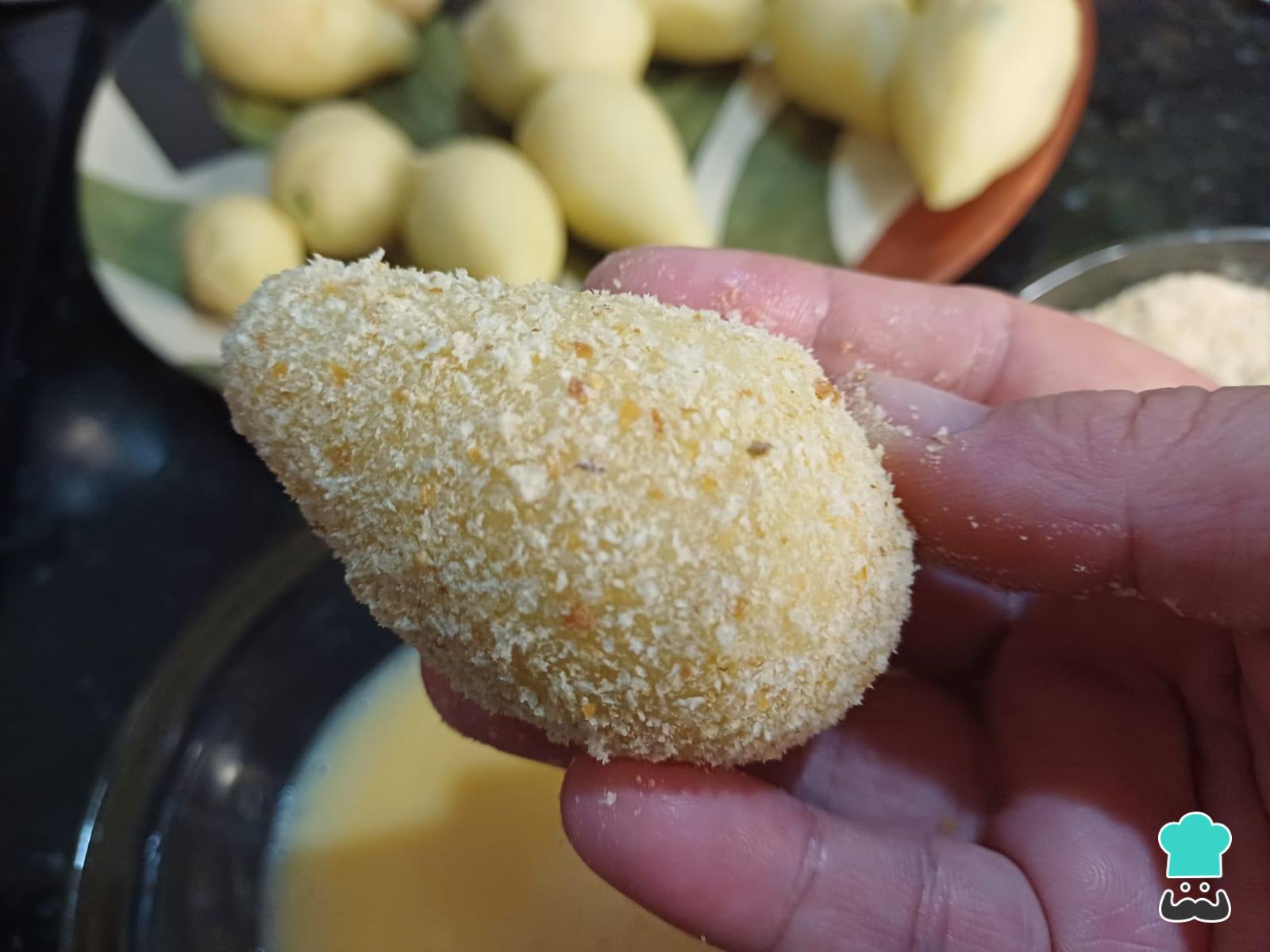 Truco: presiona bien para liberar todo el aire del interior de la croqueta de patata y pollo y que no reviente al freír.