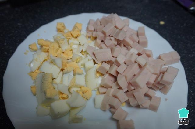 Para empezar a preparar estas croquetas de pavo y huevo duro, lo primero que hay que hacer es picar los huevos y el pavo.