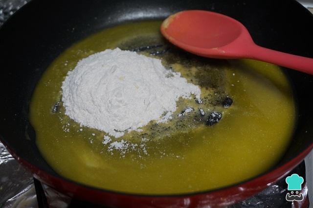 A continuación, preparamos la bechamel, así las croquetas de pavo estarán sabrosísimas. Para ello ponemos en un cazo a derretir la mantequilla, cuando esté derretida echaremos la harina, lo mezclamos y lo dejamos unos minutos para que la harina se cocine.