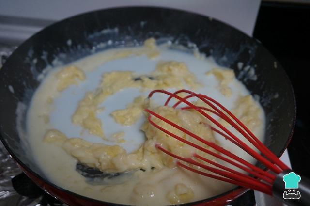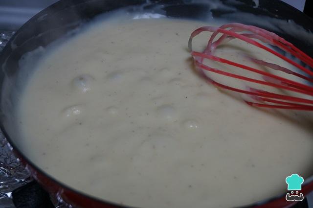 Cuando esté la harina cocinada, iremos echando la leche poco a poco, mezclando bien.