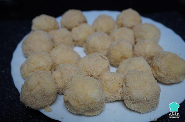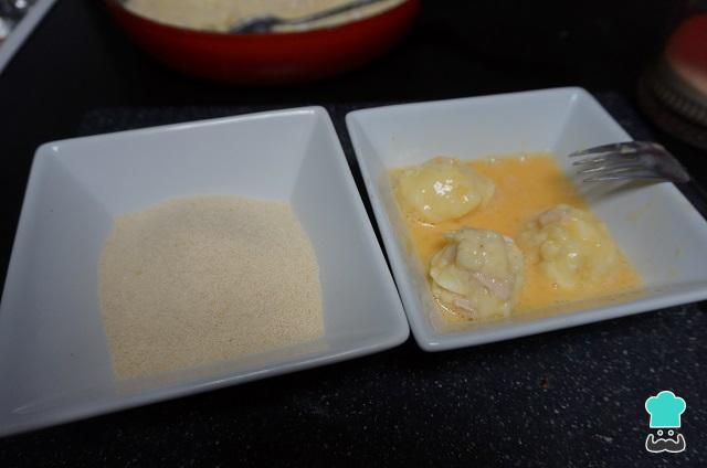 Iremos pasando las croquetas de pavo y huevo duro primero por el huevo batido y luego por el pan rallado.