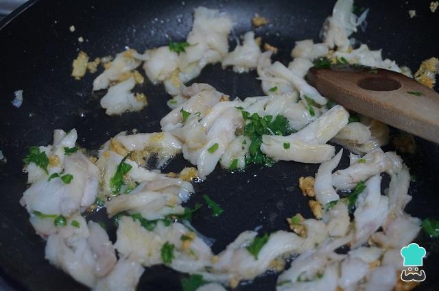 Picamos el ajo y el perejil. Ponemos una sartén con la mantequilla, añadimos el ajo y cuando este empiece a dorarse, añadimos el pescado y el perejil picado, y lo removemos todo.