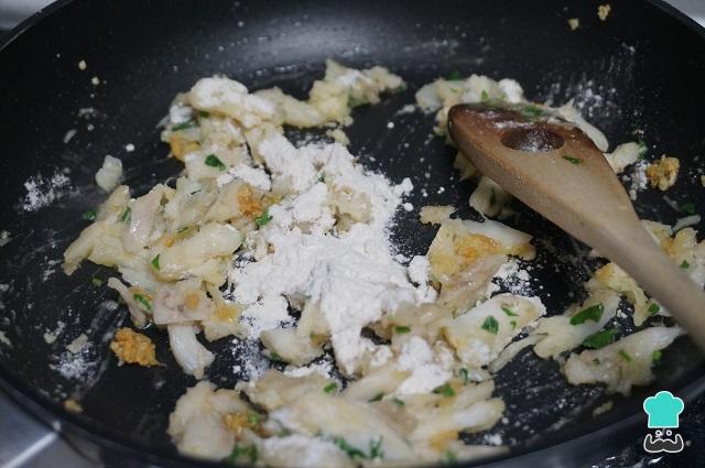 Seguido ponemos la harina removiéndola con todo el resto de los ingredientes de las croquetas de merluza.