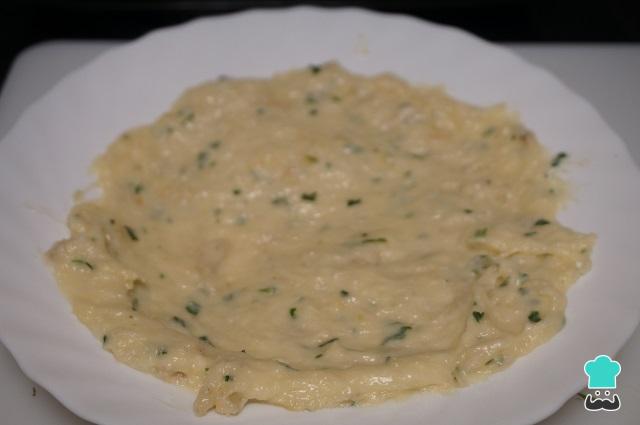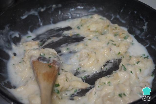 Pasamos la masa de las croquetas de pescado con bechamel a una fuente, la dejamos que se enfrié y la meteremos a la nevera unas horas.