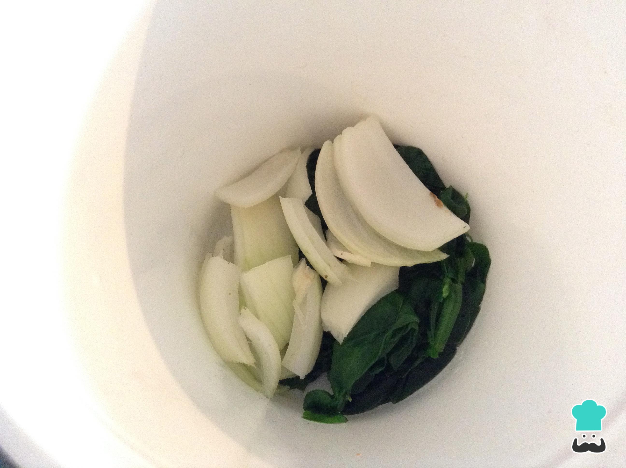 En un bol adicionar las espinacas y la cebolla blanca. Procesar hasta integrar bien y conseguir una masa uniforme.