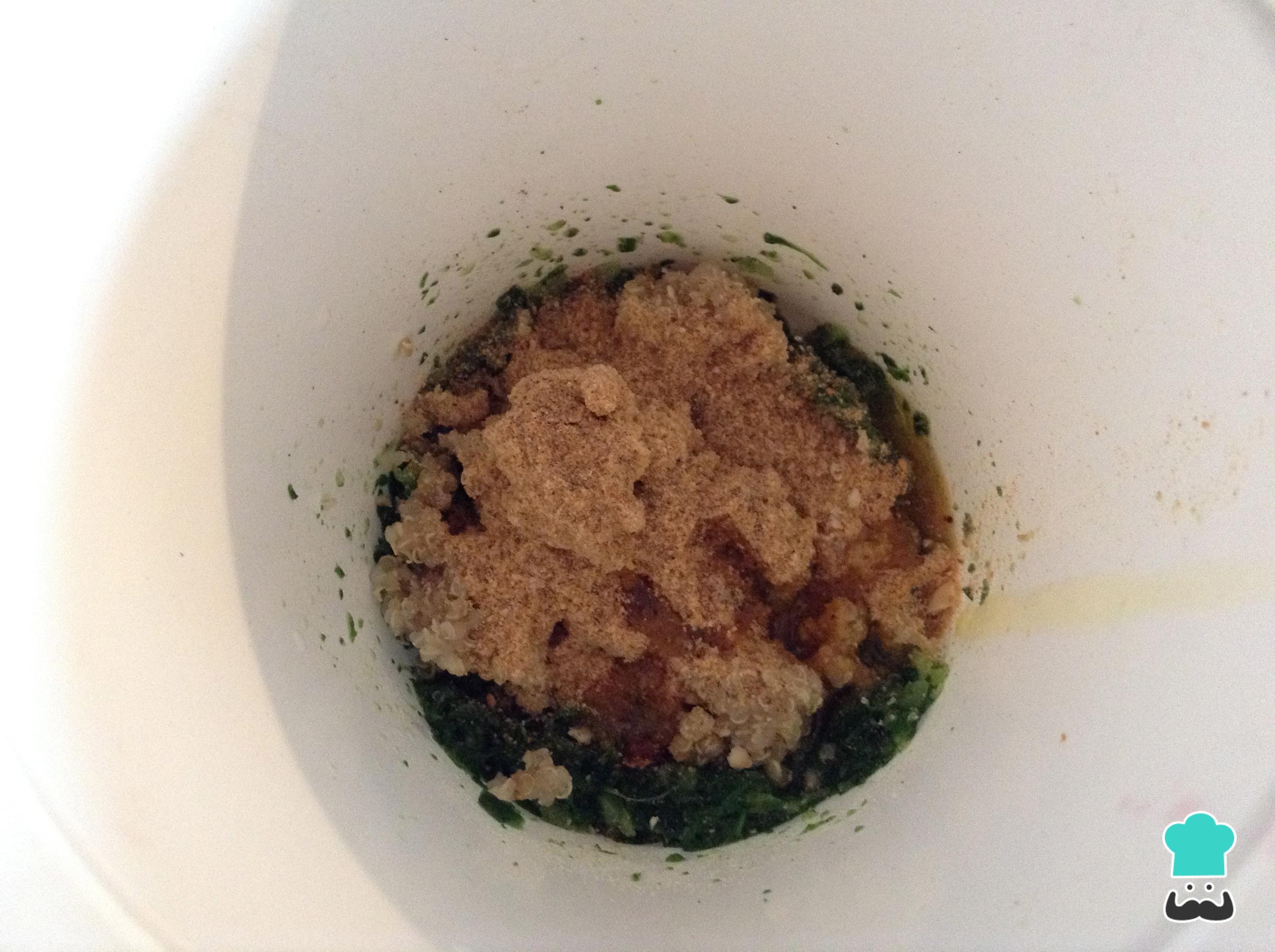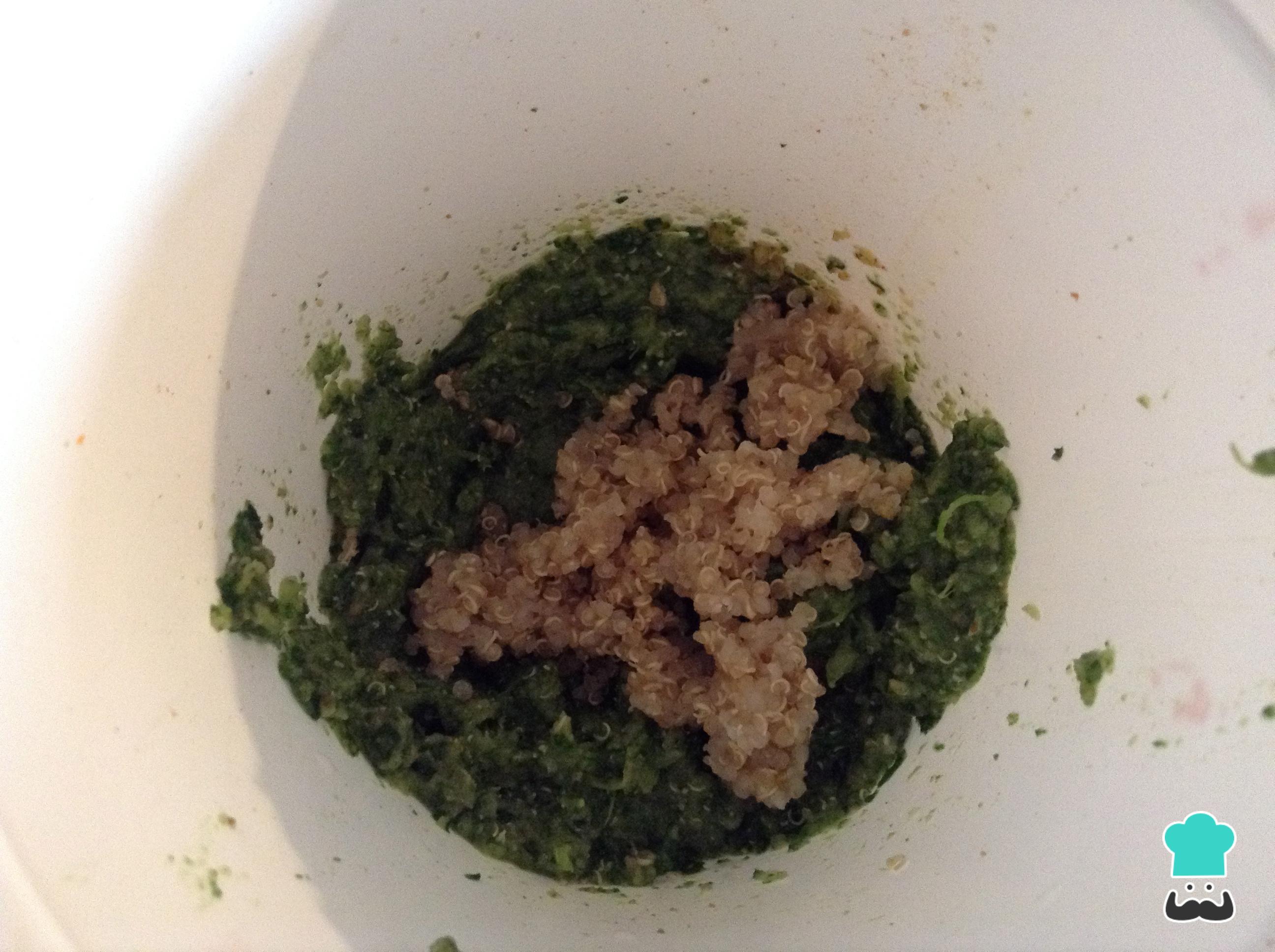 Adicionar una cucharada de miga de pan, sal, pimienta junto con la mitad de la quinoa cocida, un poco de pasta de ajo. El resultado debe ser una masa compacta y con cuerpo, si deseas puedes añadir una cucharada de aceite de oliva. Procesar hasta integrar los ingredientes muy bien.