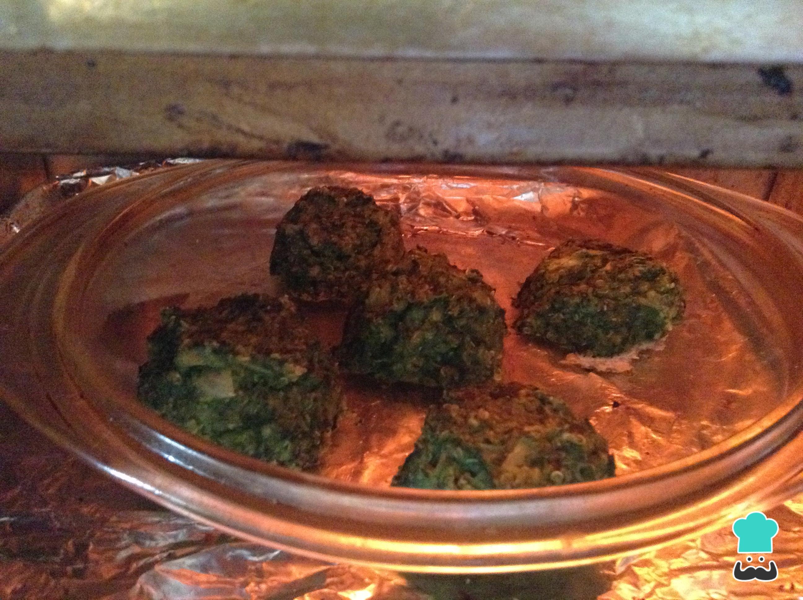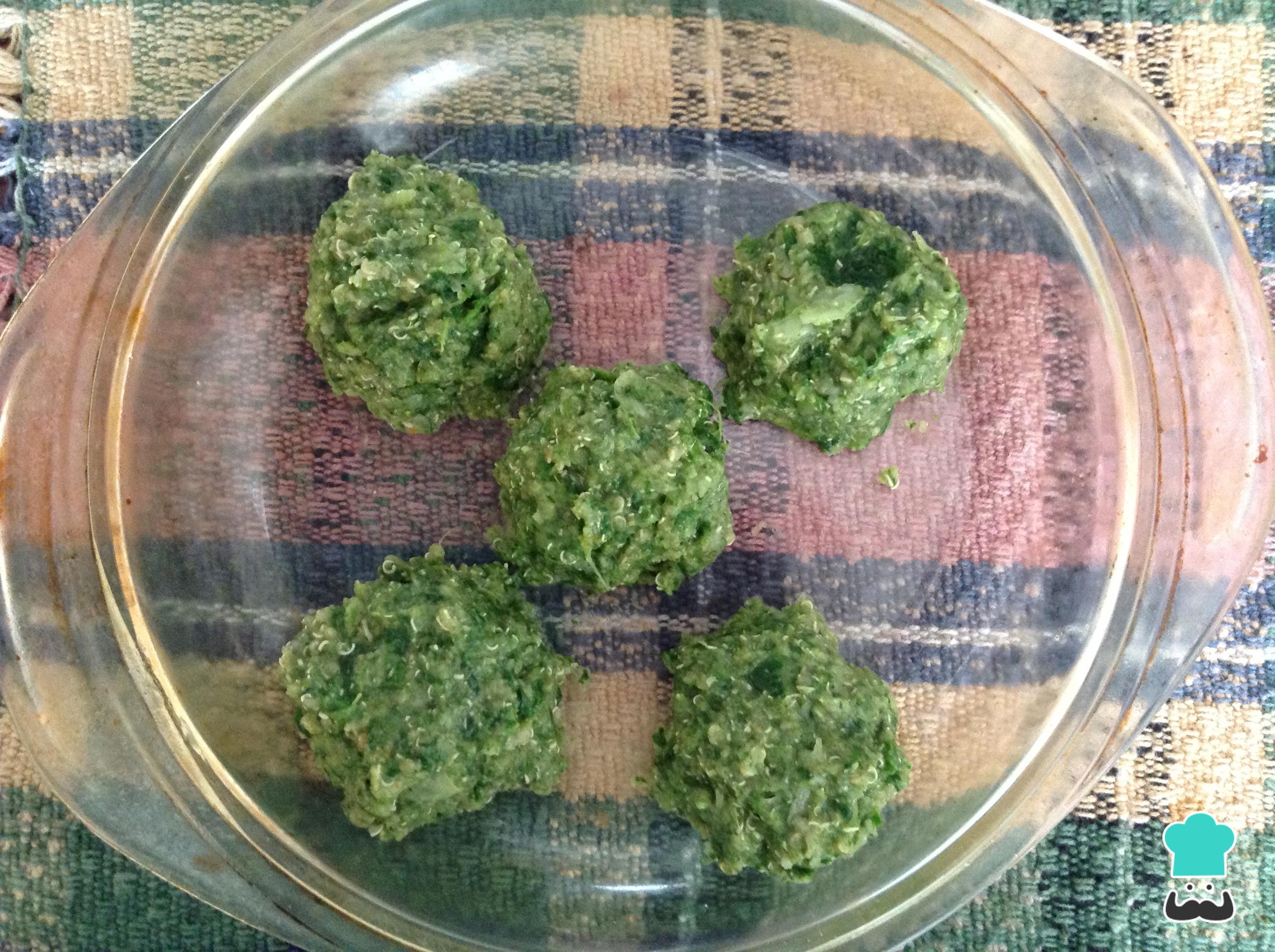 Pasado este tiempo, ya estamos listos para cocinar las croquetas verdes de quinoa. Para ello, primero engrasa una refractaria y con la ayuda de una cuchara ve colocando porciones lo más redondeadas posibles para que sean las croquetas. El tamaño es al gusto pero sin pequeñas mejor.