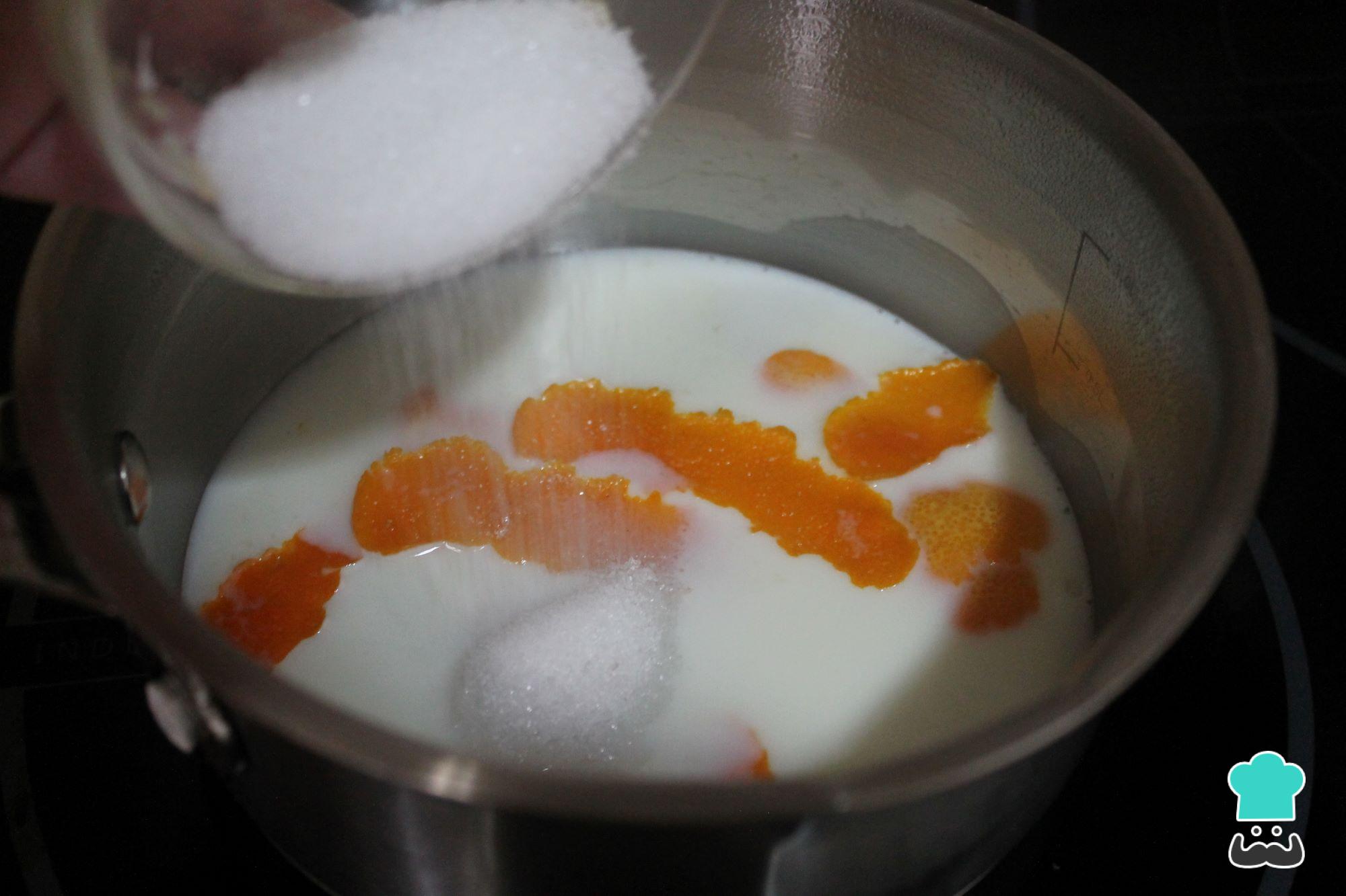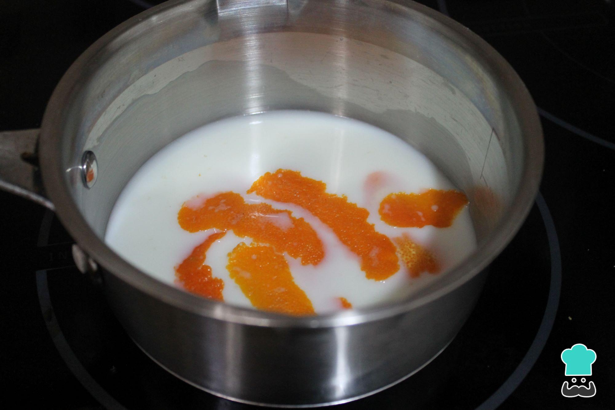 Para empezar con la receta de los crullers franceses, en primer lugar, lava bien la naranja y sécala. A continuación, pela la naranja, preferiblemente con un pelador de verduras para no coger la parte blanca, y añade la corteza junto con la leche en un cazo al fuego.