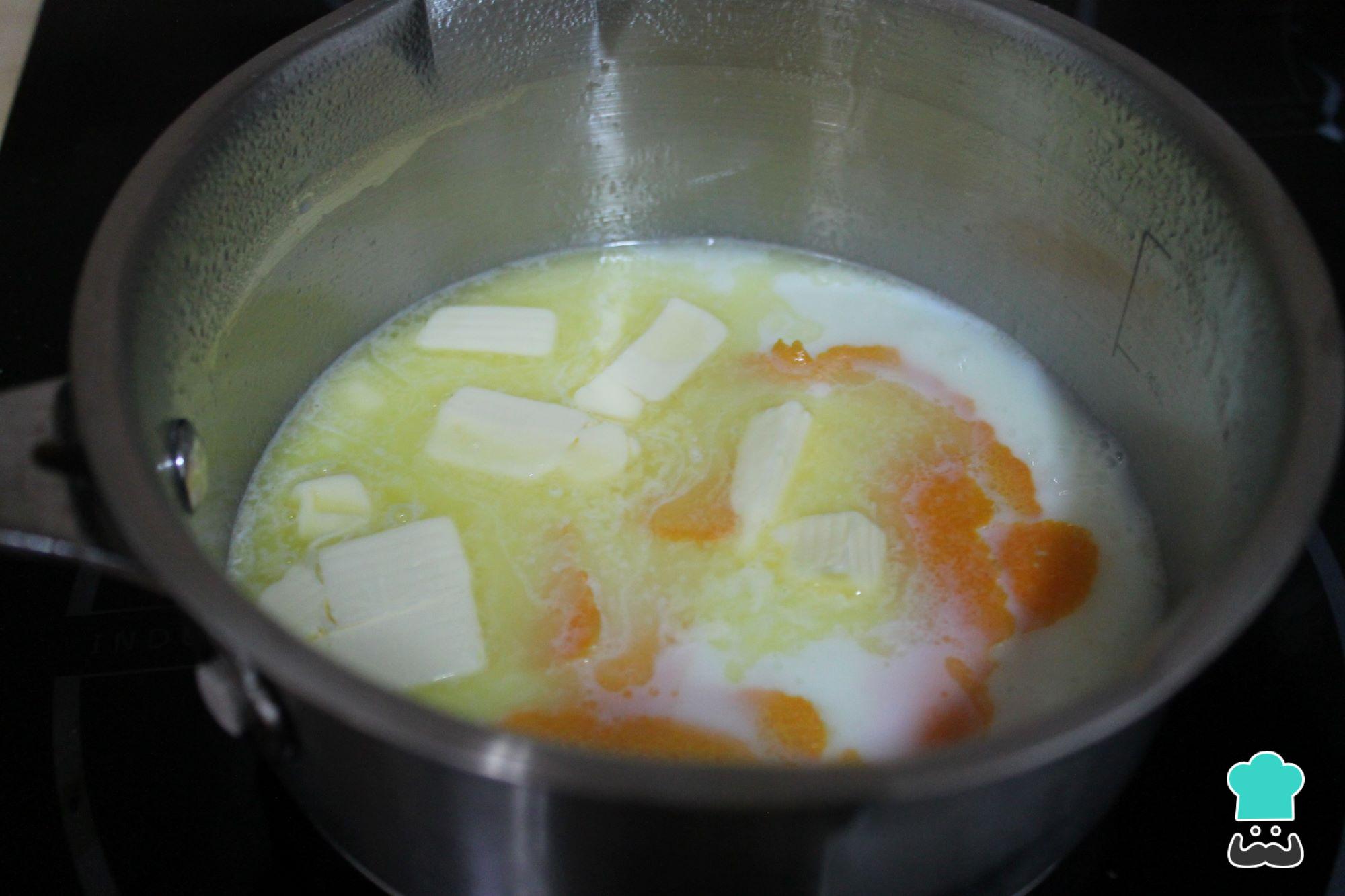 Una vez fundido el azúcar añade la mantequilla cortada en trozos y remueve con una cuchara hasta que se haya disuelto del todo y sea todo una mezcla homogénea. Cuando esté todo bien disuelto, retira la piel de la naranja.