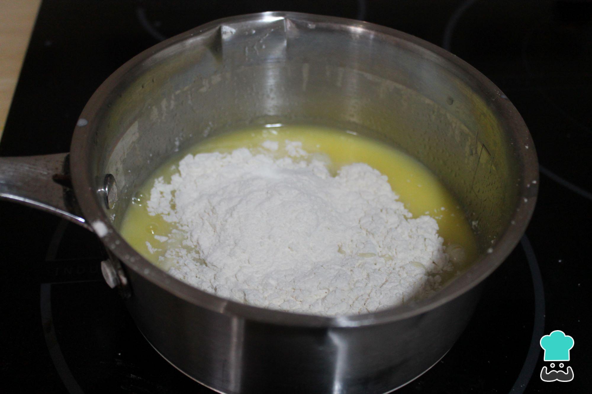 Pon la pizca de sal en la harina y añade de golpe a la leche caliente. Baja un poco el fuego y ve removiendo la harina con la leche. Luego, deja cocer, y, mientras, sigue removiendo hasta que la masa se despegue de las paredes y forme una bola.