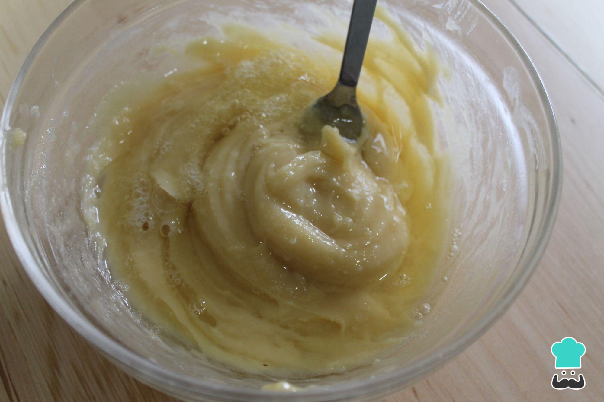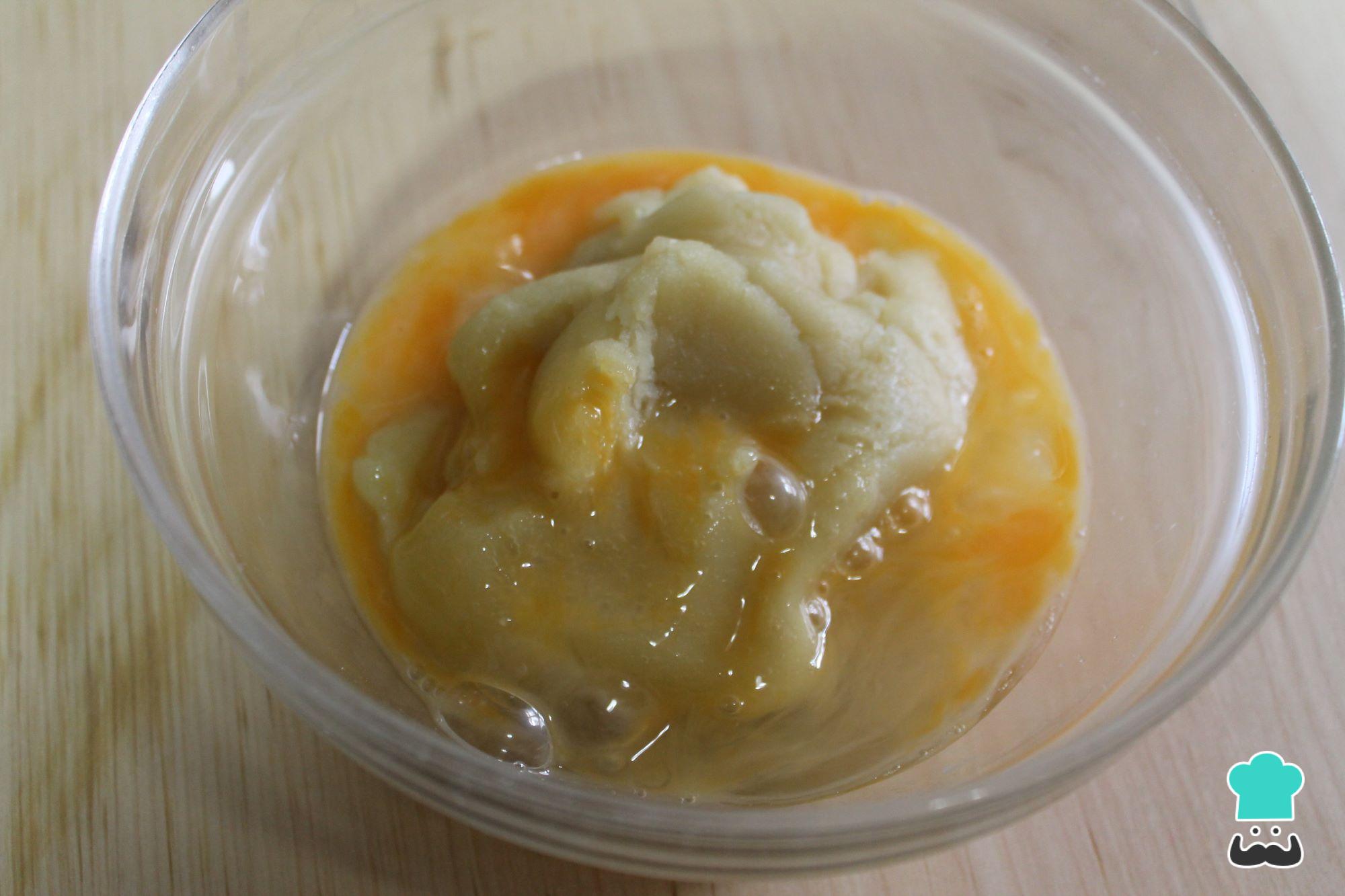 Retira el cazo del fuego y pon la bola de masa de los crullers resultantes en otro bol. Seguido, bate ligeramente el huevo y añade a la masa de crullers. Remueve bien hasta integrar el huevo batido.