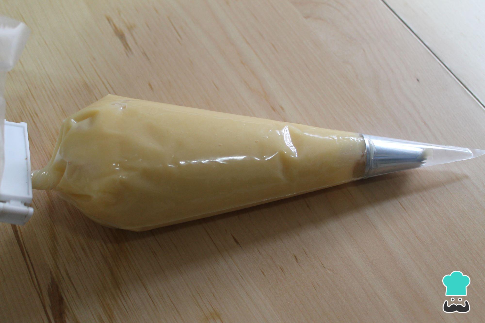 Añade la masa de crullers en una manga pastelera con una boquilla rizada y deja que enfríe un poco.