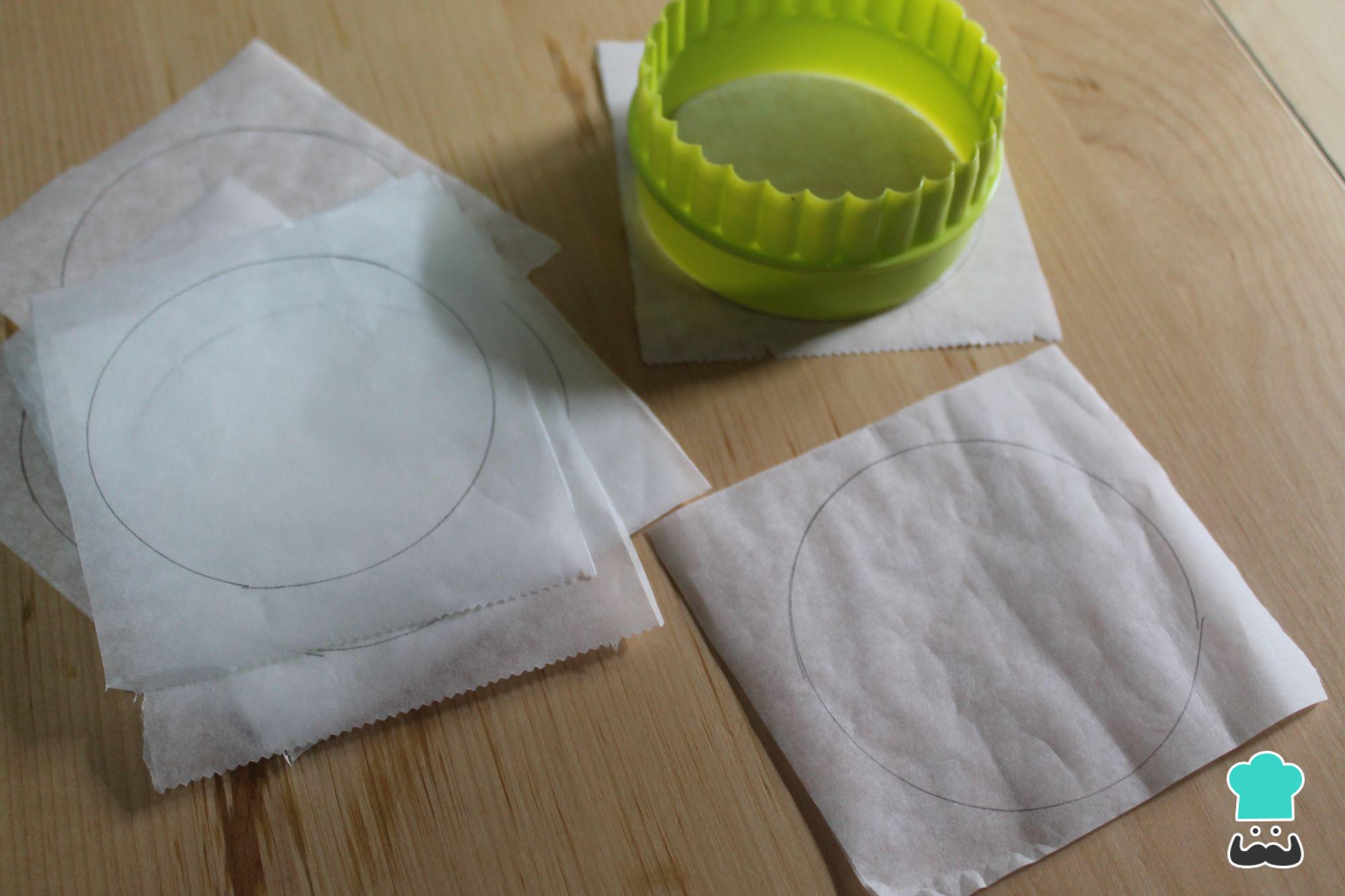 Mientras la masa se atempera, recorta cuadrados de 10x10 de papel de horno. Seguido, con ayuda de un cortapastas redondo, una tapa o un vaso, dibuja en cada cuadrado de papel un círculo de unos 8 cm de diámetro.