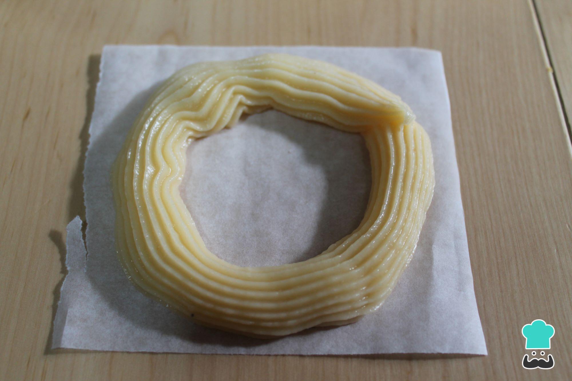 Con ayuda de la manga pastelera dibuja los crullers franceses en los círculos que has preparado de papel. Intenta que los círculos queden gruesos y con la masa bien apretada.