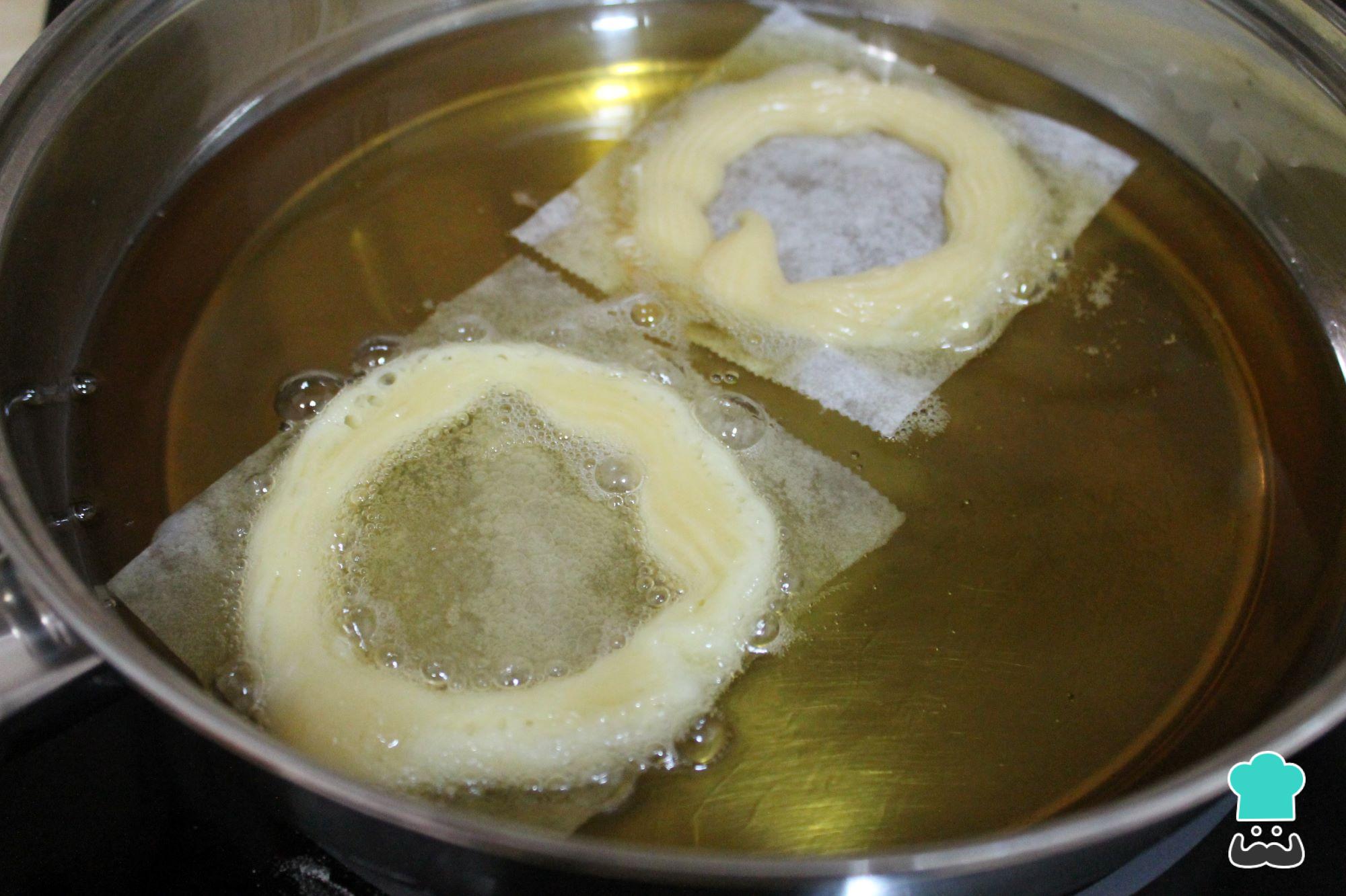 Calienta el aceite de girasol en una olla amplia y cuando esté bien caliente, añade los papeles con la masa de crullers. No coloques muchos a la vez para que se frían bien. Al poco tiempo de introducir los crullers para freírlos, podrás retirar los papeles con cuidado, deberías hacerlo unas pinzas de cocina. A continuación, dora ligeramente los crullers franceses por cada lado y ve retirando en un plato con papel de cocina.