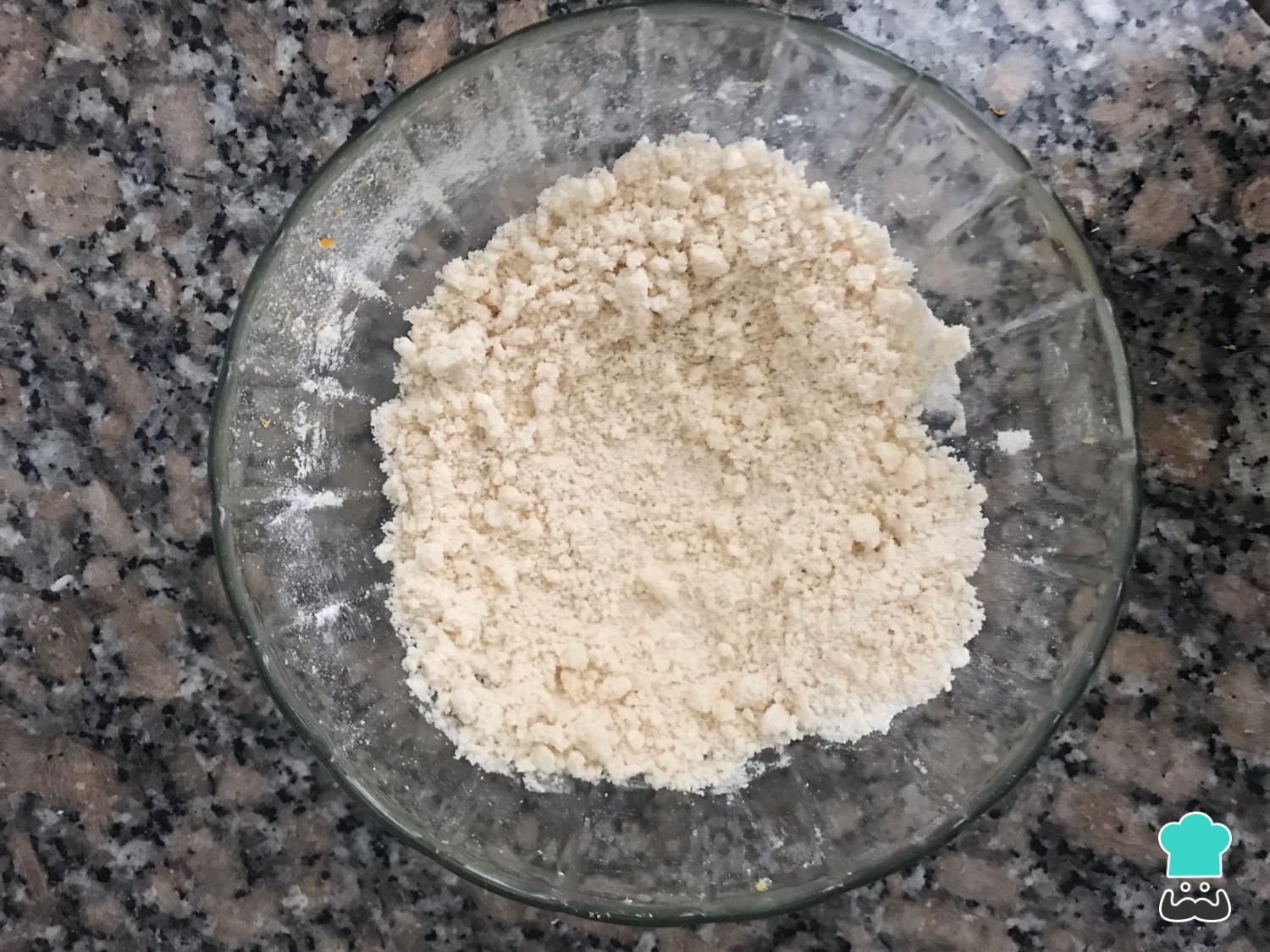 Para empezar a preparar estos deliciosos y húmedos cuadraditos de naranja, haz un arenado con la harina, la ralladura de naranja y los aceites o manteca. Utiliza las yemas de tus dedos para obtener una textura similar a la que puedes ver en la imagen.