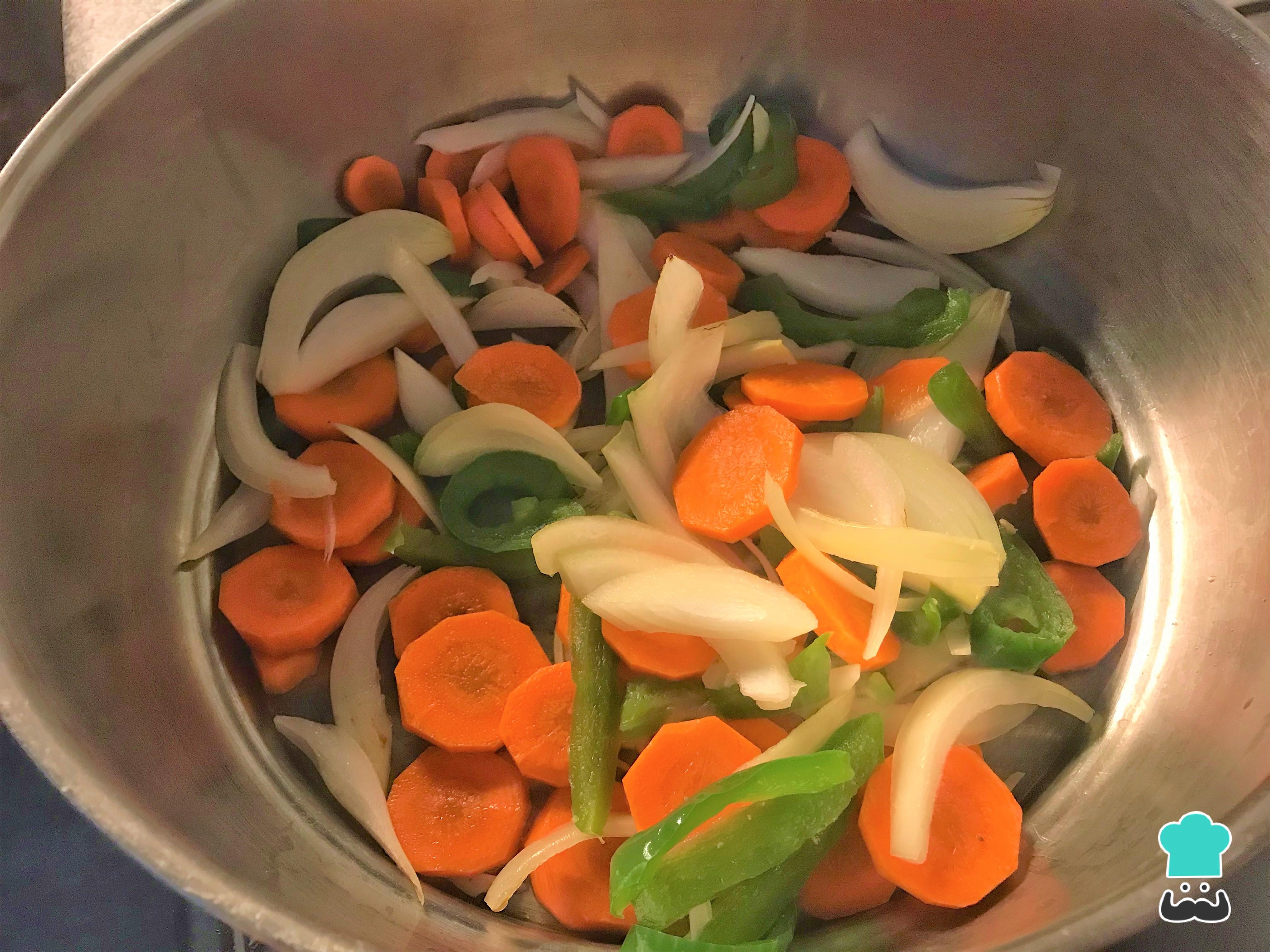 Si te preguntas cómo hacer cuete mechado al horno, esta receta es perfecta para ti. Así pues, para empezar con la receta de cuete mechado navideño, primero pela y corta la cebolla y la zanahoria en pluma y rodajas, respectivamente. También, lava y corta en juliana el ají. A continuación, dora los ingredientes en una sartén amplia con 1 cucharadita de aceite. Cuando estén dorados, retíralos y disponlos en una asadera como colchón para tu cuete.