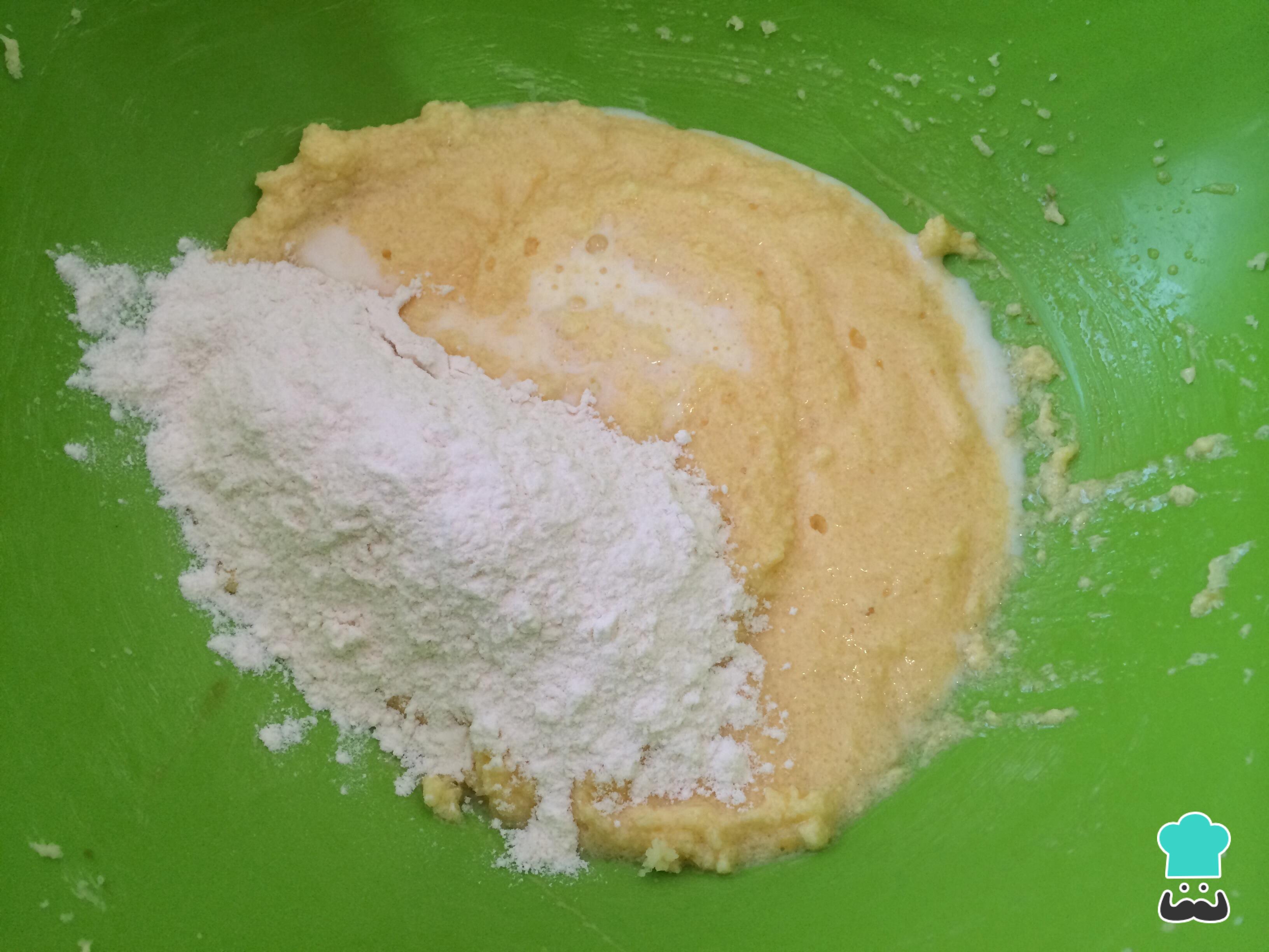 Agregar la mitad de la harina con el polvo de hornear y la mitad de la leche. Mezclar muy bien y cuando esté todo integrado, añadir el resto de ingredientes hasta obtener una mezcla suave y homogénea.