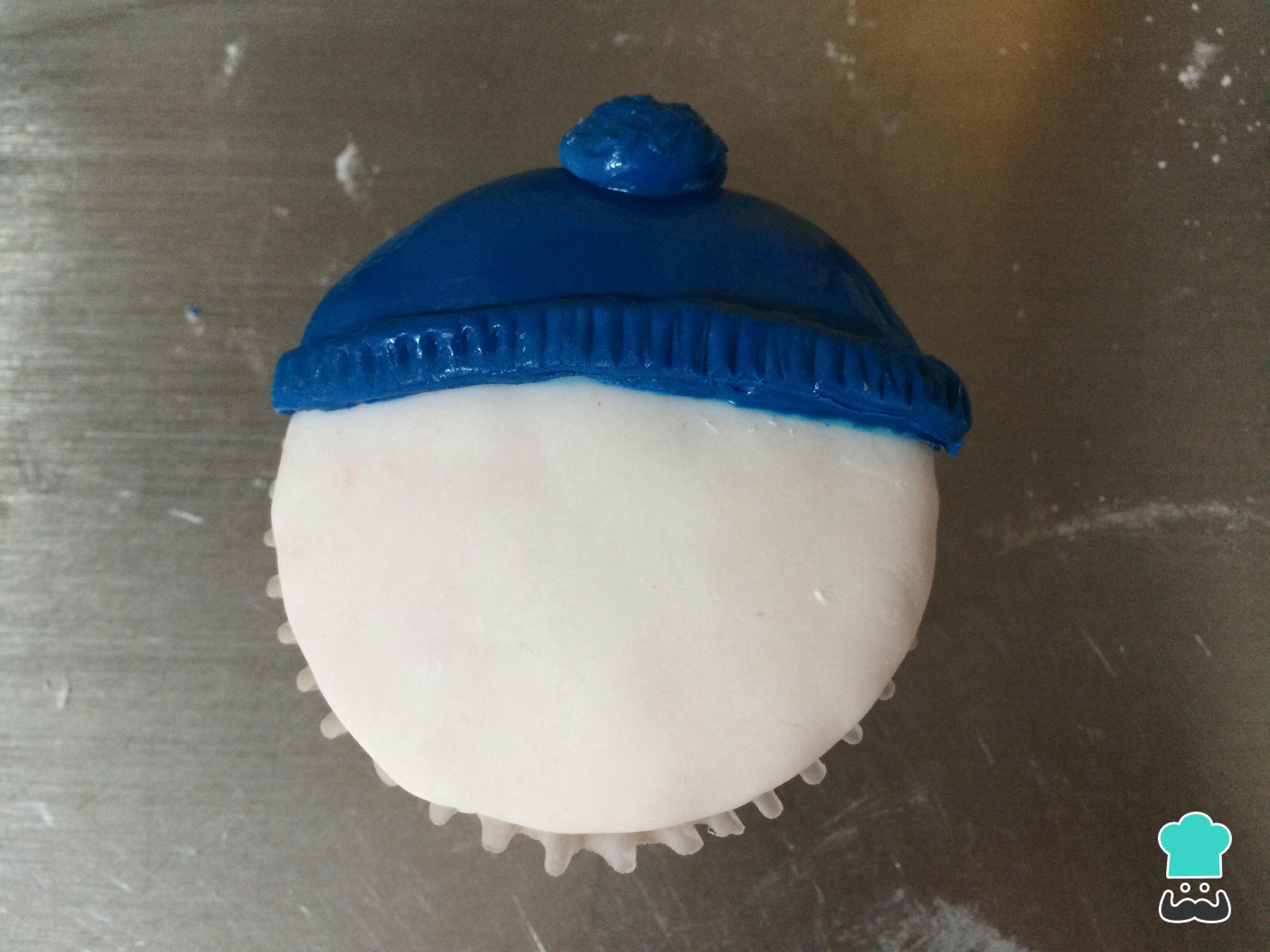 Estirar el fondant color blanco y con un cortador circular del tamaño del cupcake, cortar y pegar sobre éste con un pincel con agua, de inmediato pegar el gorro y retirar el exceso de azúcar glass con el pincel. Luego, hacer una tira de fondant azul y pegar en la parte de abajo del gorro, hacer una bola azul y pegar en la parte de arriba. Para dar textura y mas realismo realizar unas líneas y puntos en las partes pegadas anteriormente.
