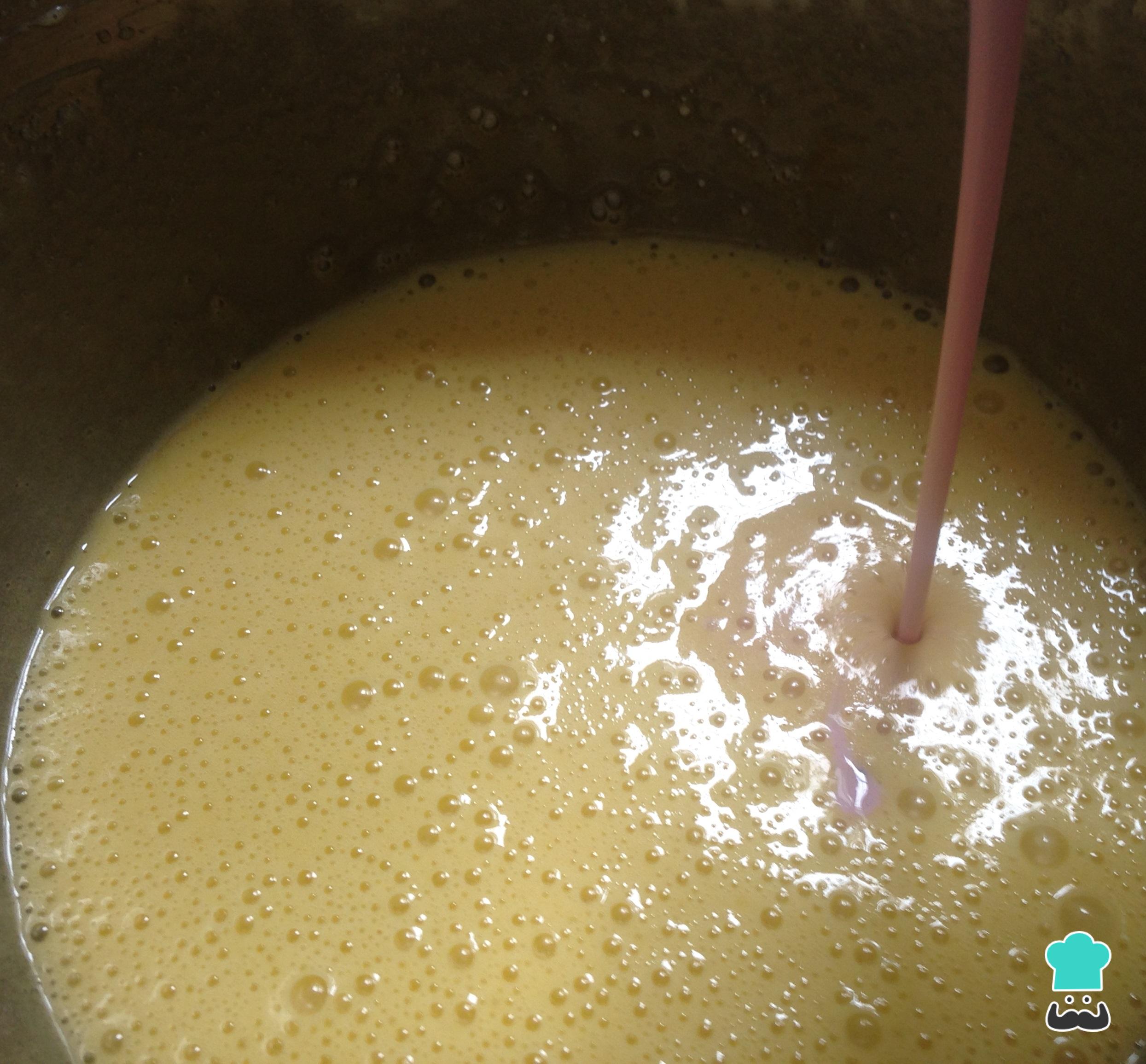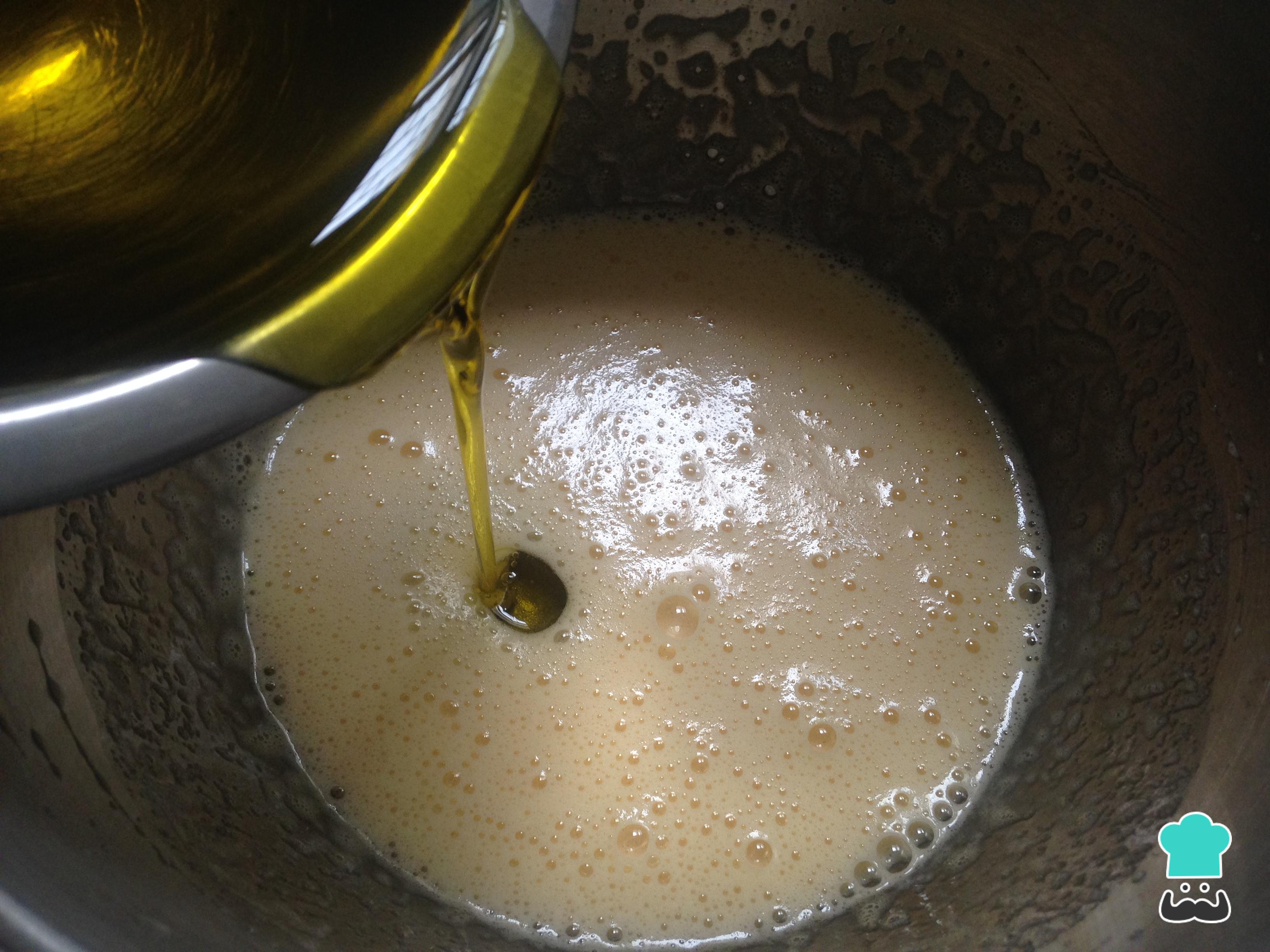 Batir los huevos con el azúcar, agregar el aceite de oliva y seguir batiendo.