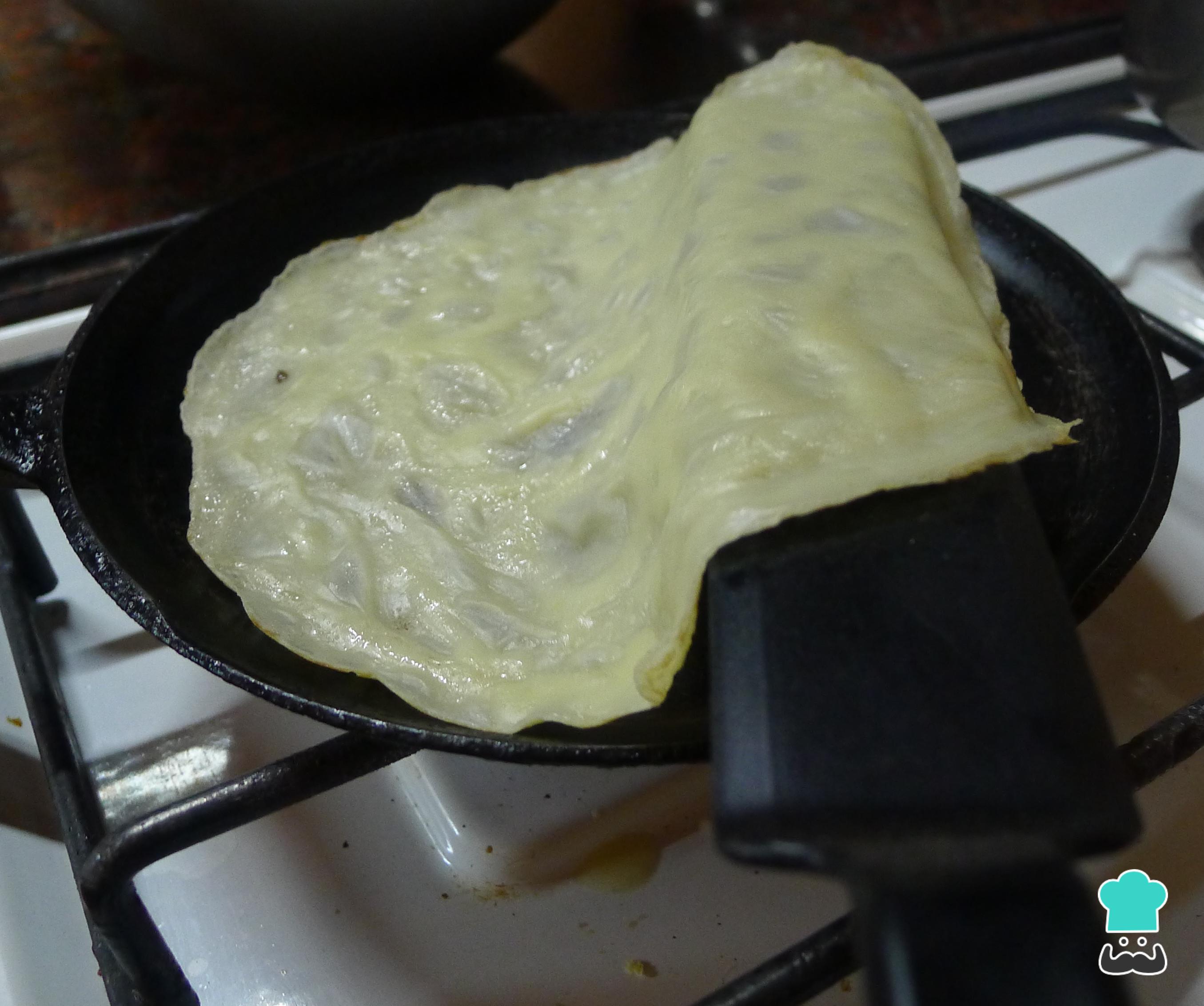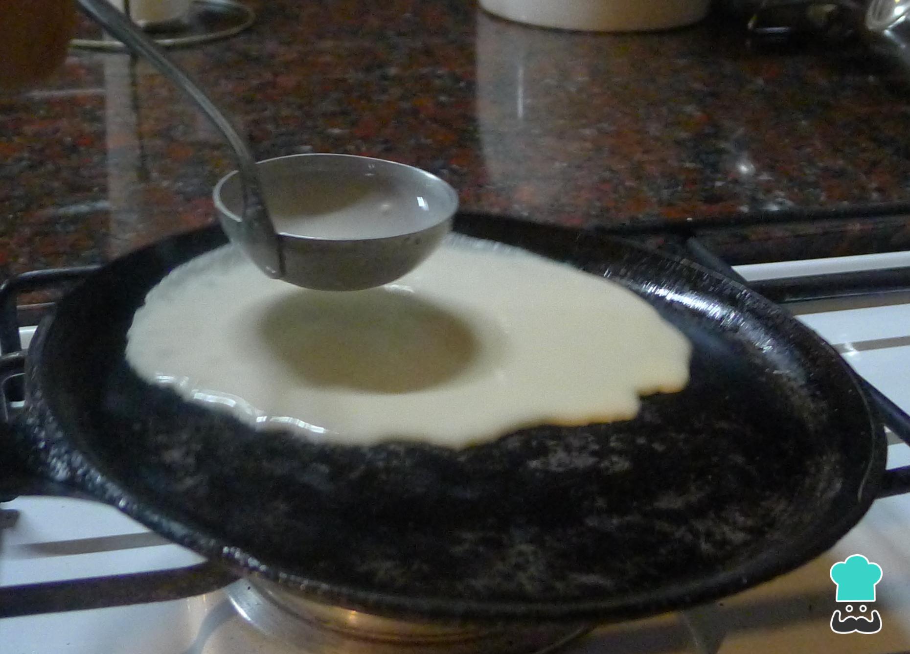 En una sartén anti-adherente derretir una cucharadita de mantequilla y volcar un cucharon de la mezcla, levantando del fuego para ayudar a que se extienda uniformemente.