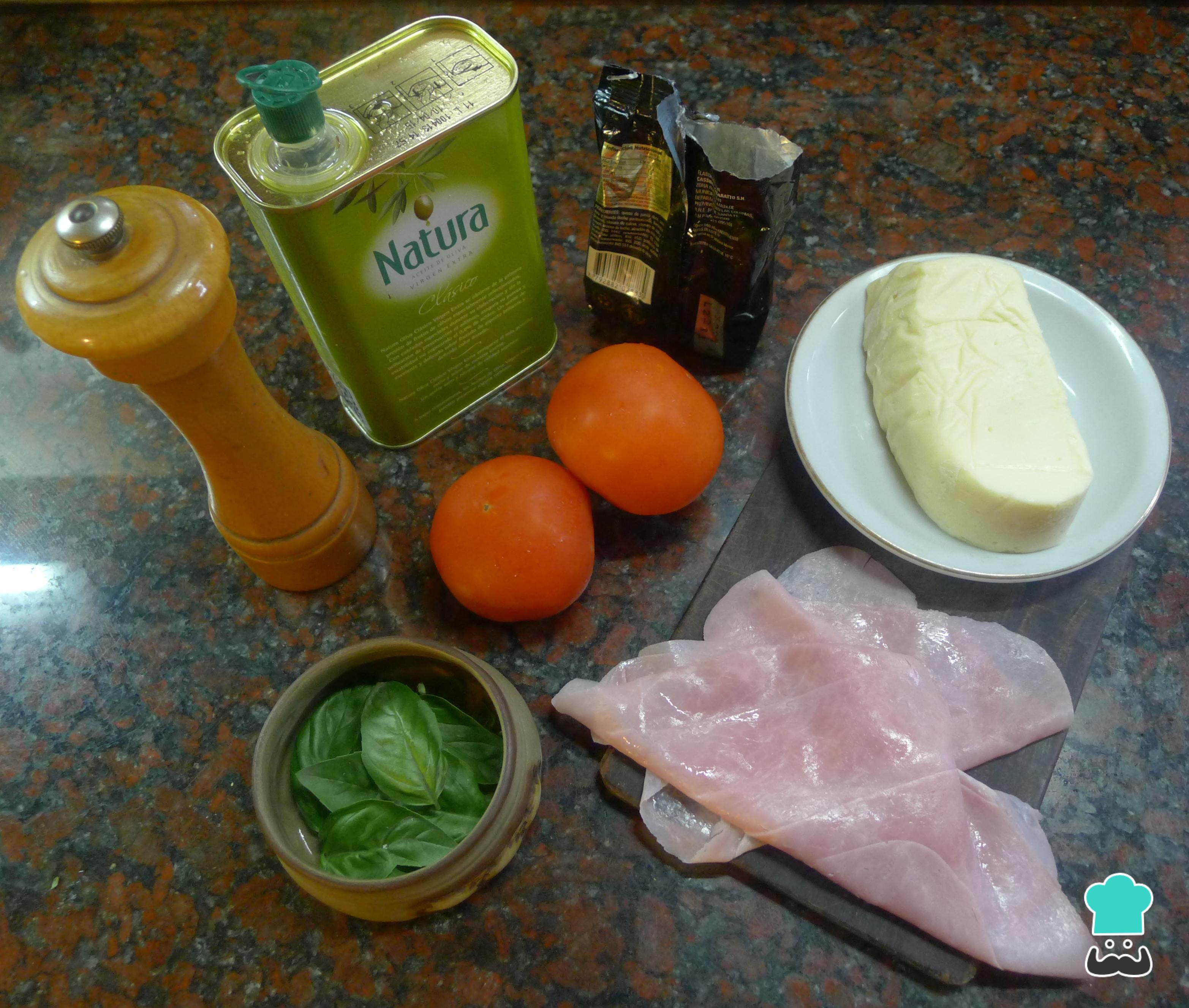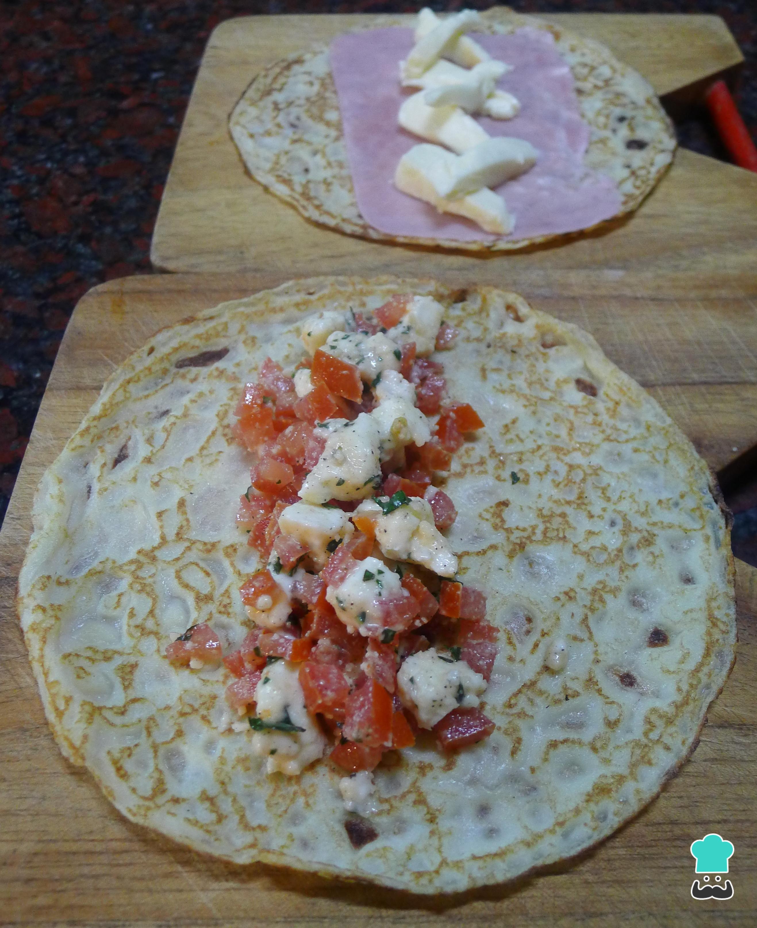 Para disfrutar de estas deliciosas crepes prepararemos varios rellenos. Primero, habrá que lavar los tomates, abrirlos en 4, quitarles la pulpa y cortarlos en pequeños cubitos. Cortar en trozos una parte del queso mozzarella (y reservar la otra parte para el relleno de jamón).