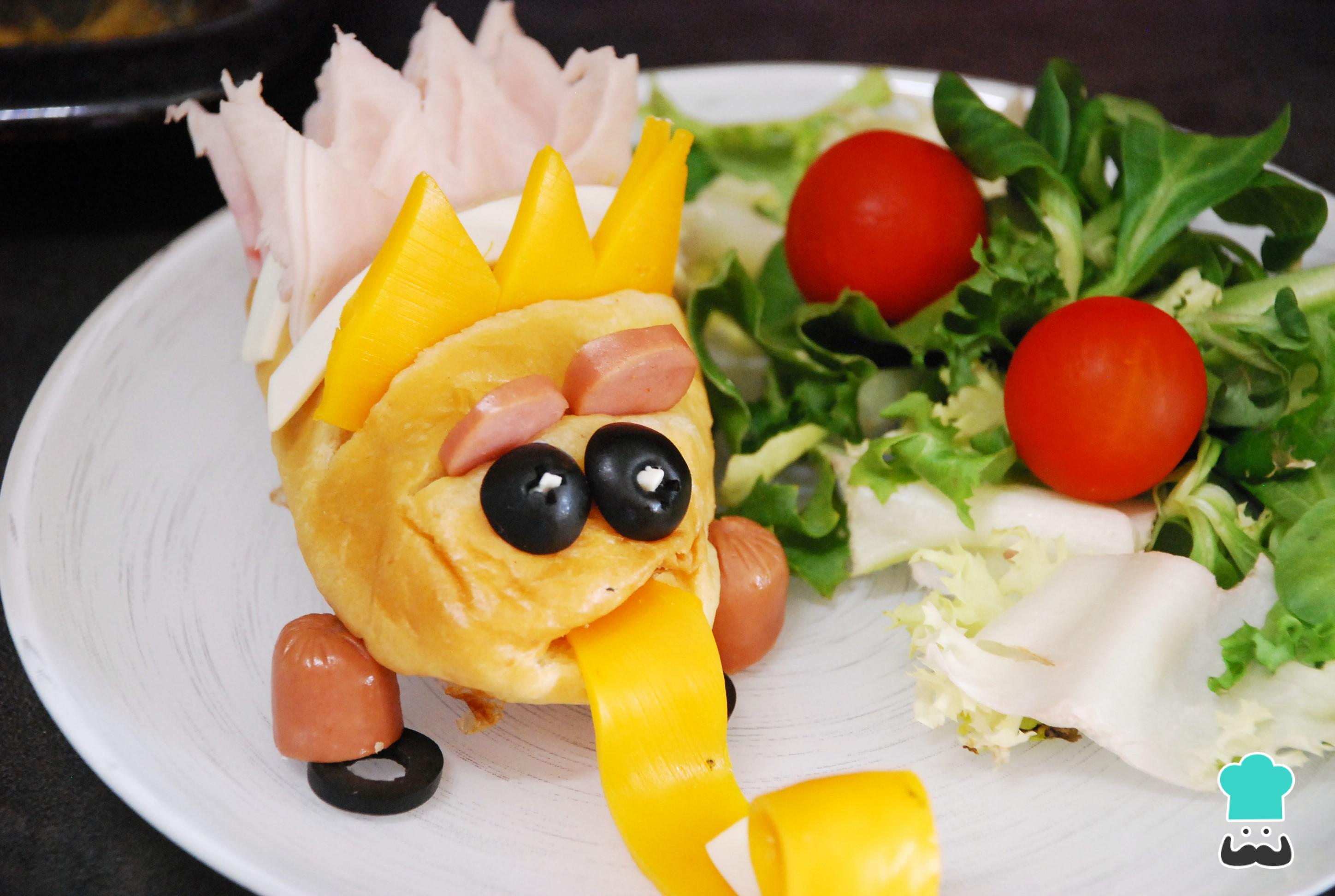 Lo mejor de esta receta para niños es que puedes variar cualquiera de los ingredientes al gusto. Lo importante es que haya diversidad de colores y tengas algo con que hacer los ojos, en este caso, las aceitunas negras y el queso blanco.