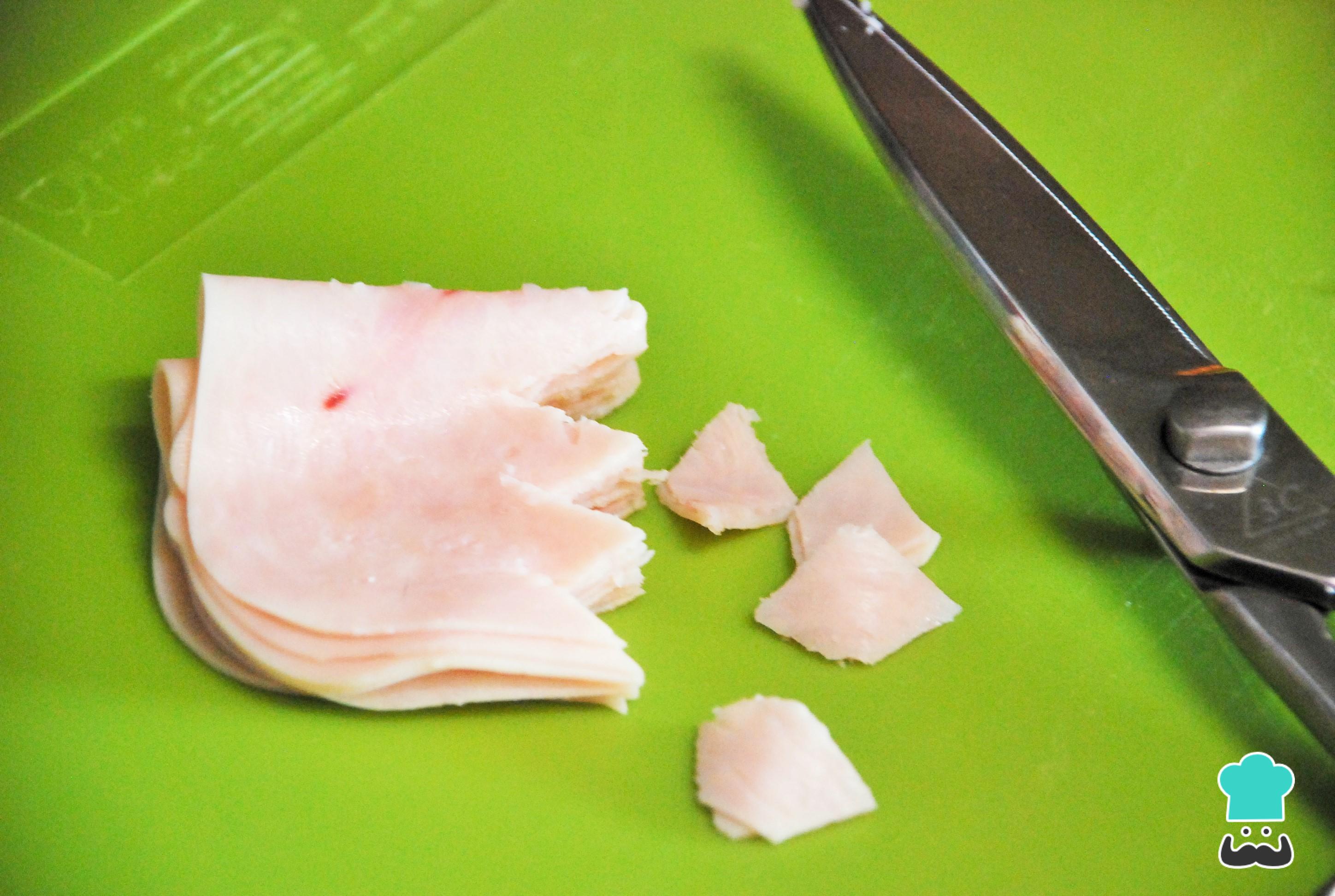 Dobla la loncha de jamón dulce en cuatro y, con ayuda de una tijera, corta picos triangulares.