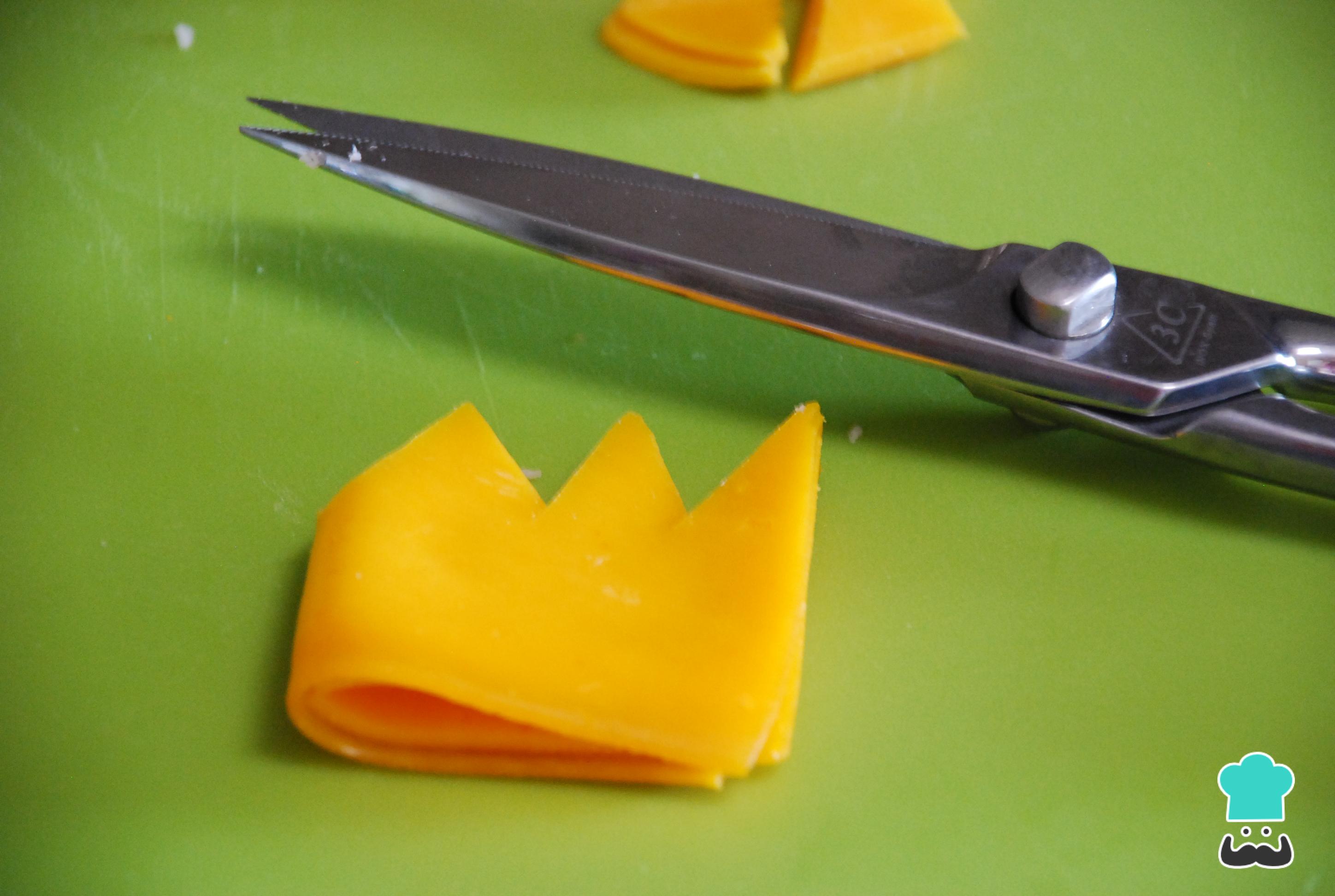 Repite la operación con el queso cheddar, pero aparta una tira larga no muy gruesa. La utilizaremos para hacer la lengua de nuestro sándwich en forma de monstruo.