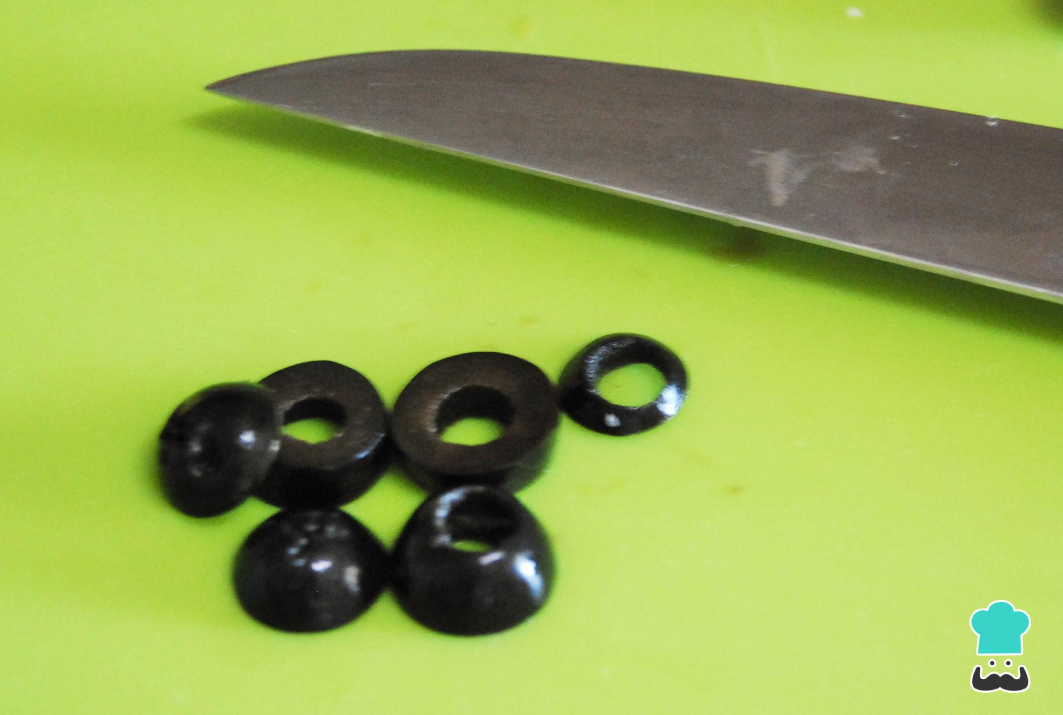 Corta las aceitunas negras y coloca un trozo de queso blanco en el centro para hacer los ojos.