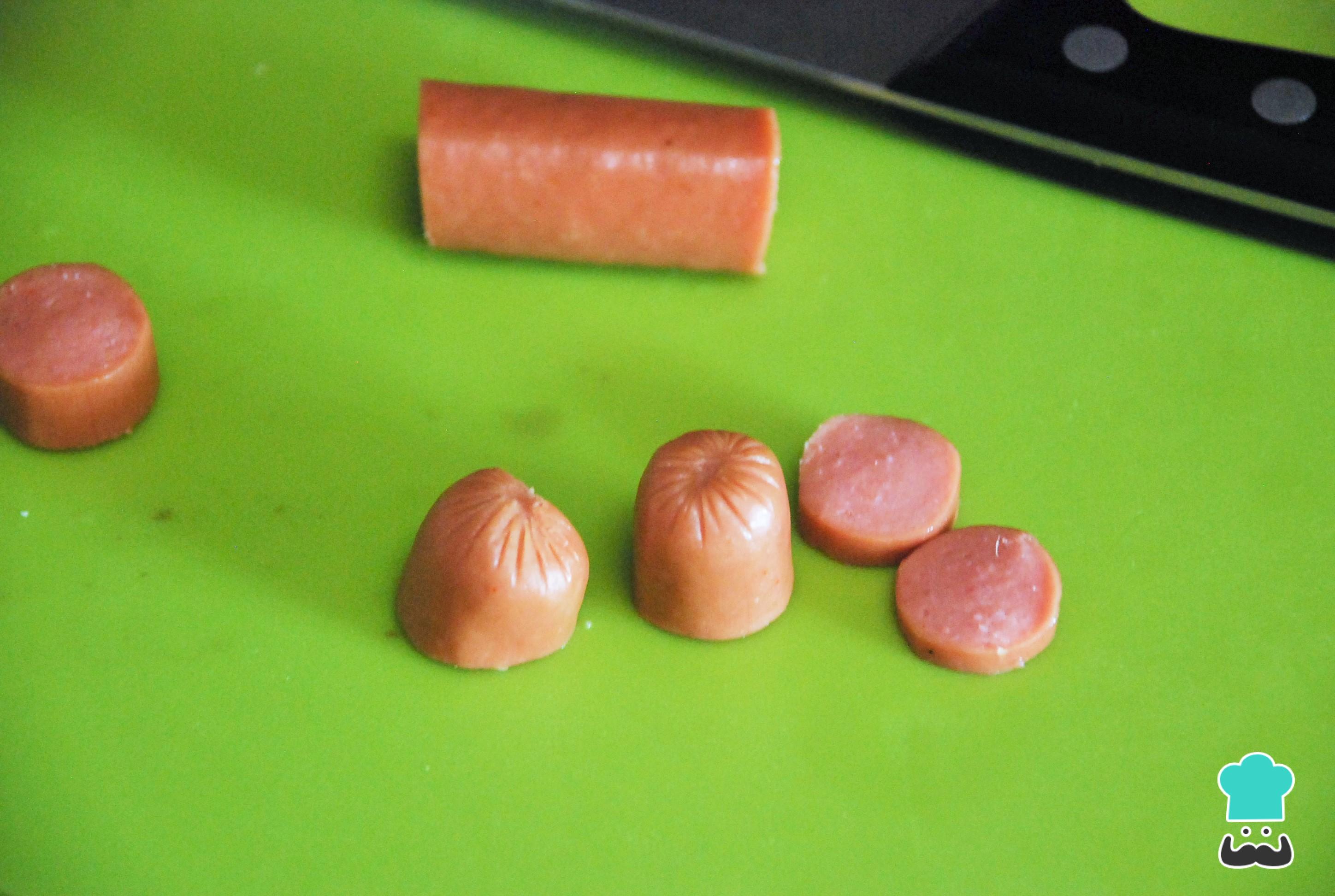 Cocina la salchicha de forma tradicional, puedes hacerlo en el microondas, a la plancha o con agua hirviendo. Una vez cocida, corta 4 tacos que serás las patas del sándwich para niños.