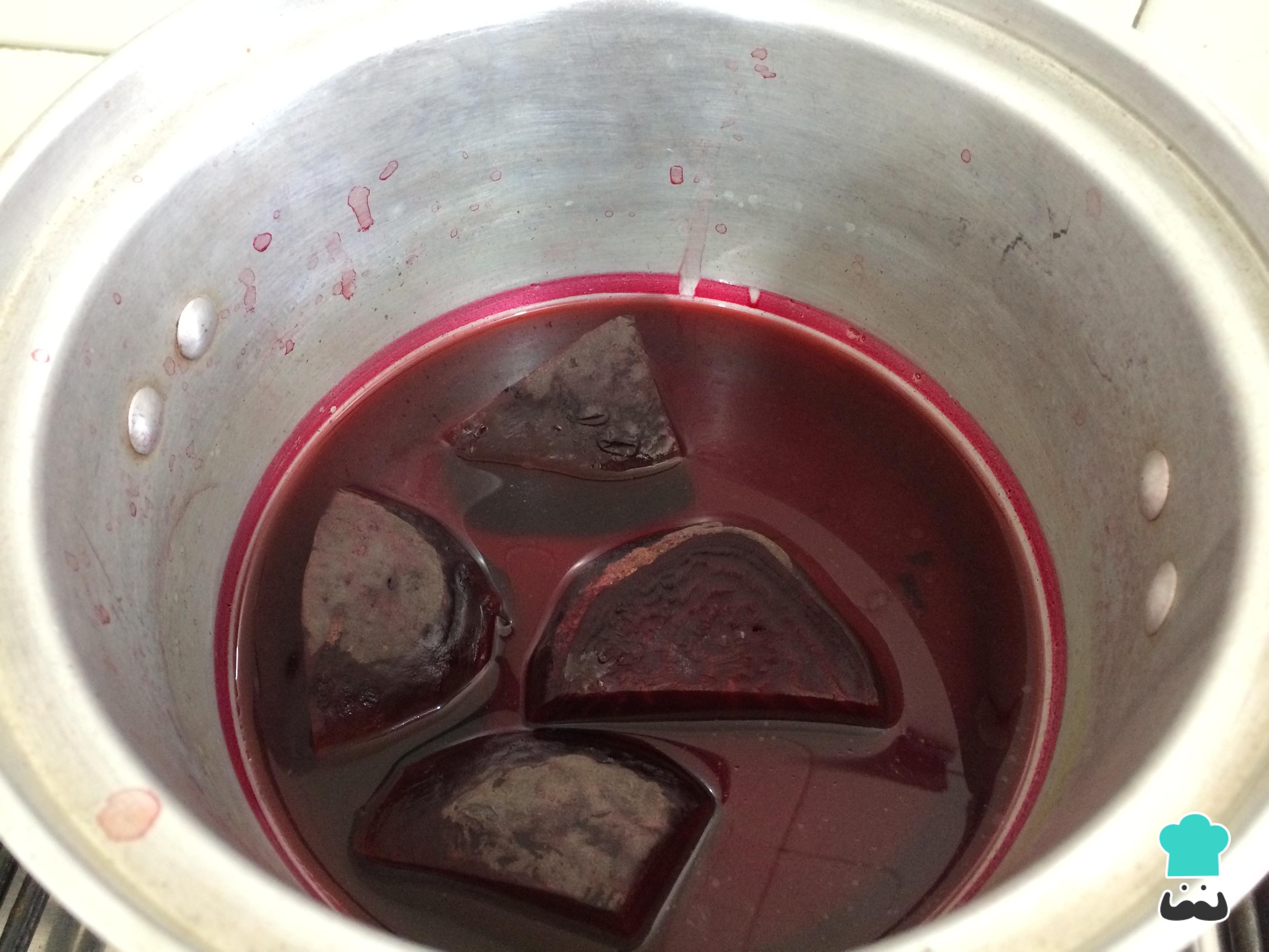 Cocinar la remolacha cortada en trozos pequeños durante 30 minutos a fuego medio. Cuando la remolacha esté cocinada pelar con un cuchillo.