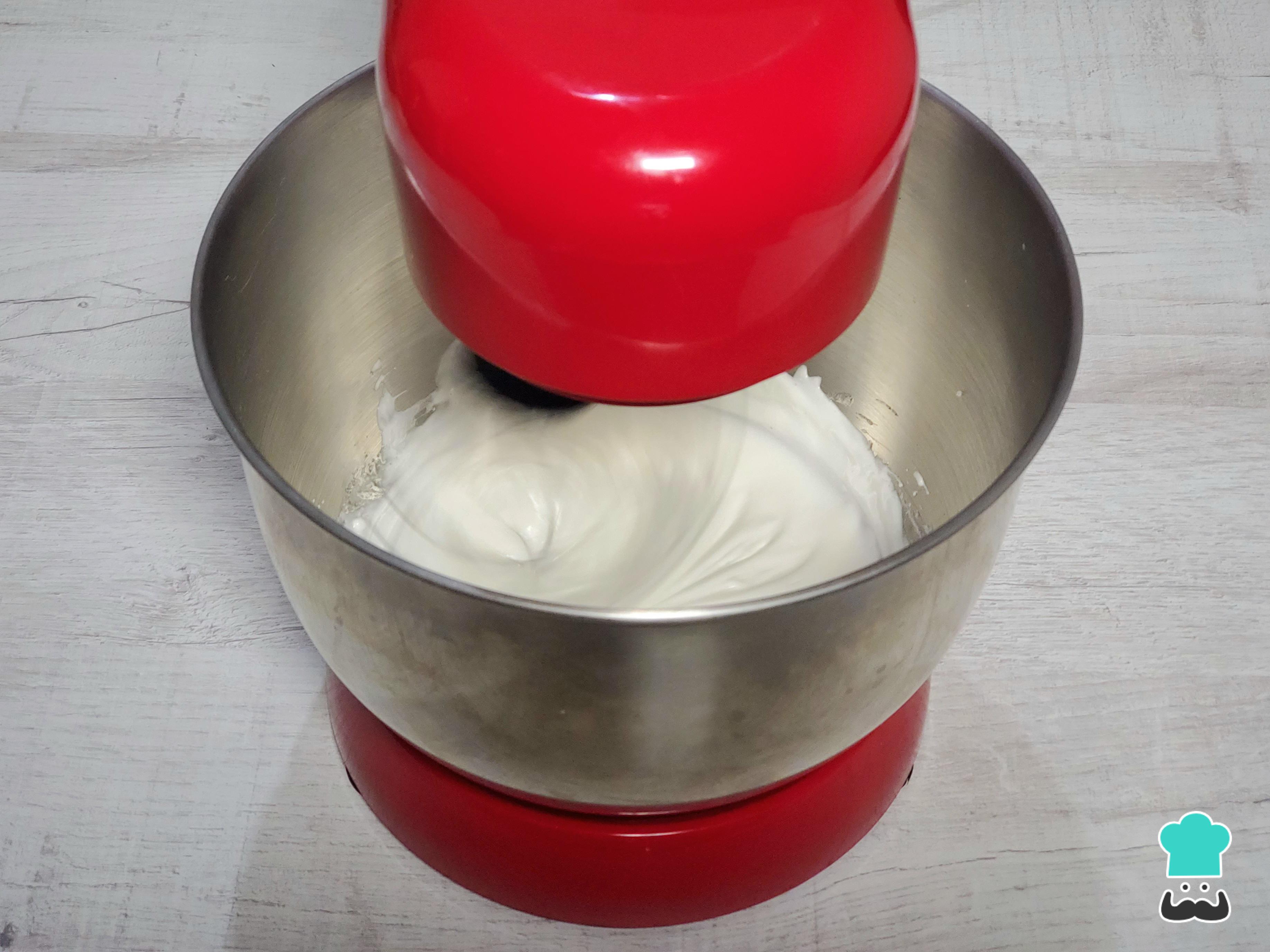 - Coloca en el bowl de la batidora 500 gramos de crema de leche bien fría y bate a máxima velocidad hasta que forme picos suaves.