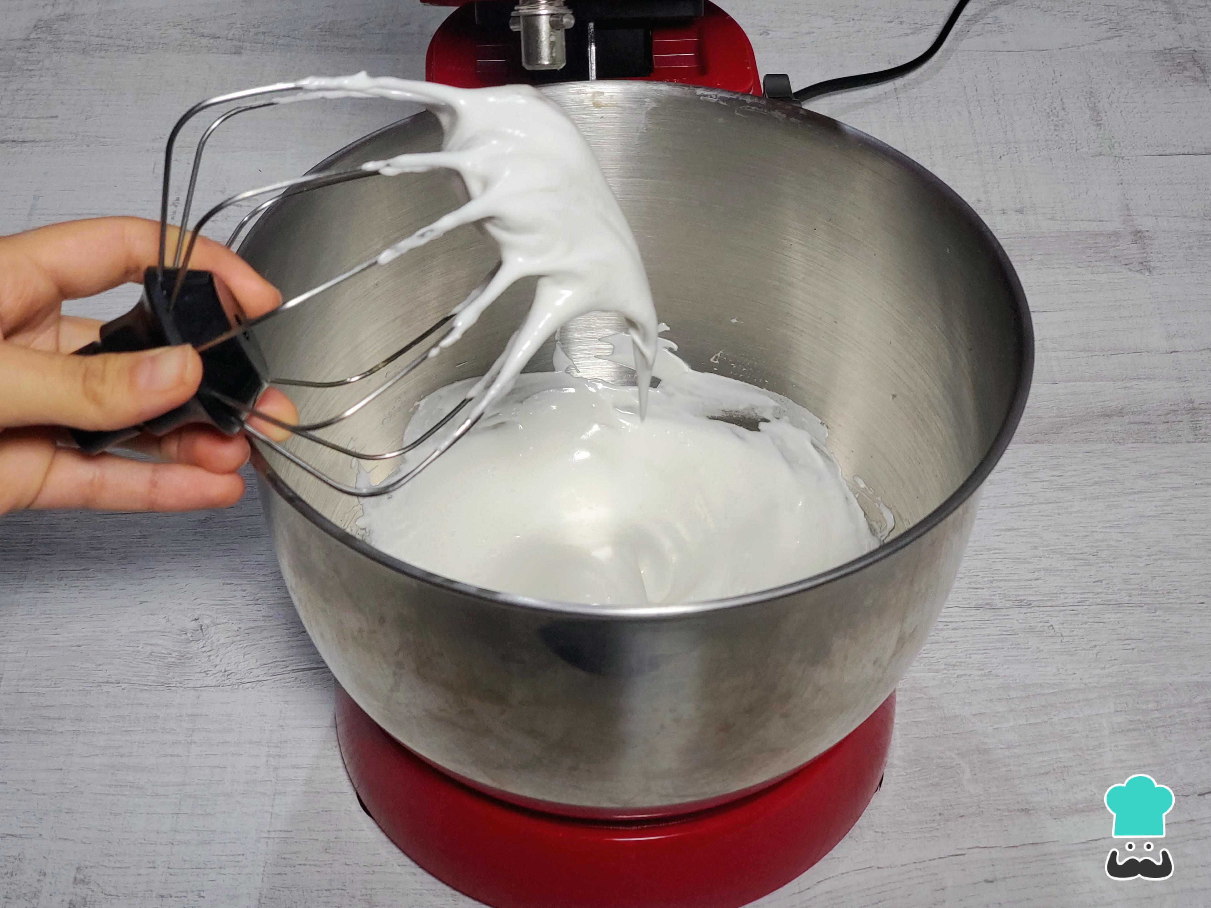 Vierte el azúcar blanca común sobre las claras en forma de lluvia mientras sigues batiendo a máxima velocidad, hasta que se forme un merengue de picos firmes. Para comprobarlo, introduce el batidor de globo en el merengue y levántalo: si el pico que se forma se mantiene sin moverse ni bajarse, está listo.