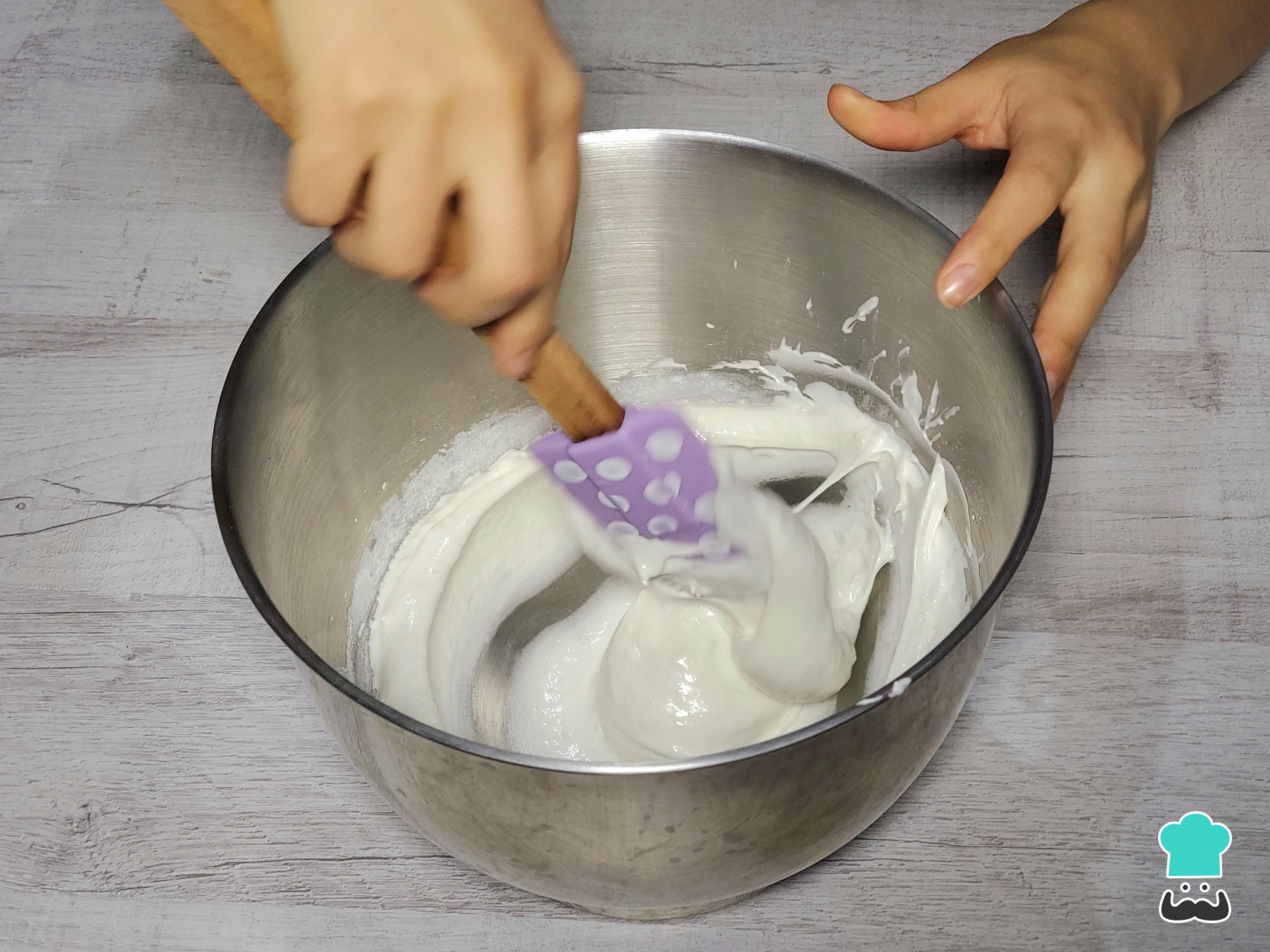 Mezcla dando movimientos envolventes usando una espátula de goma. Para lograr una integración uniforme sin romper la estructura aireada que se formó durante el batido, gira la espátula de arriba hacia abajo en movimientos circulares mientras rotas el bowl.