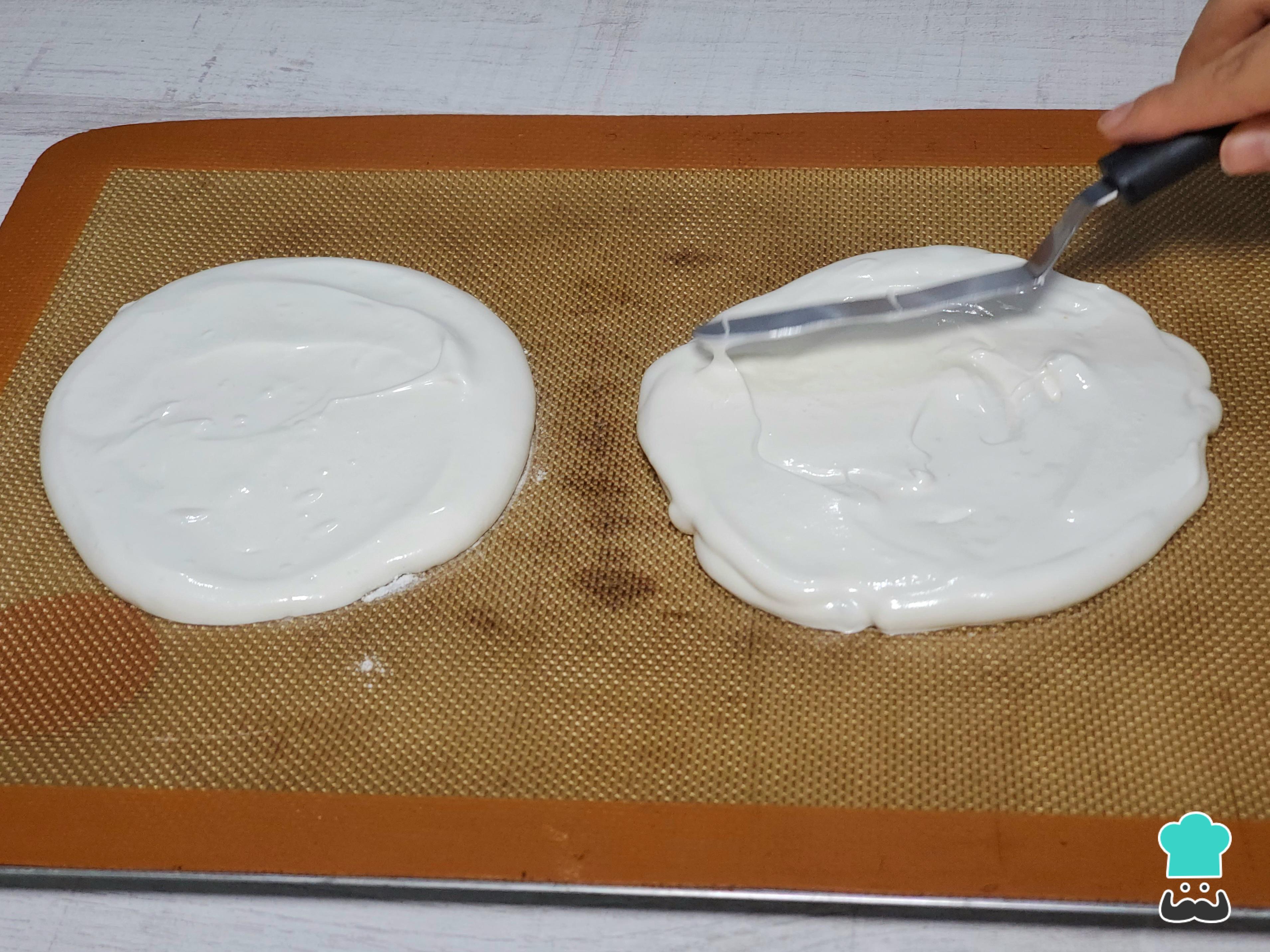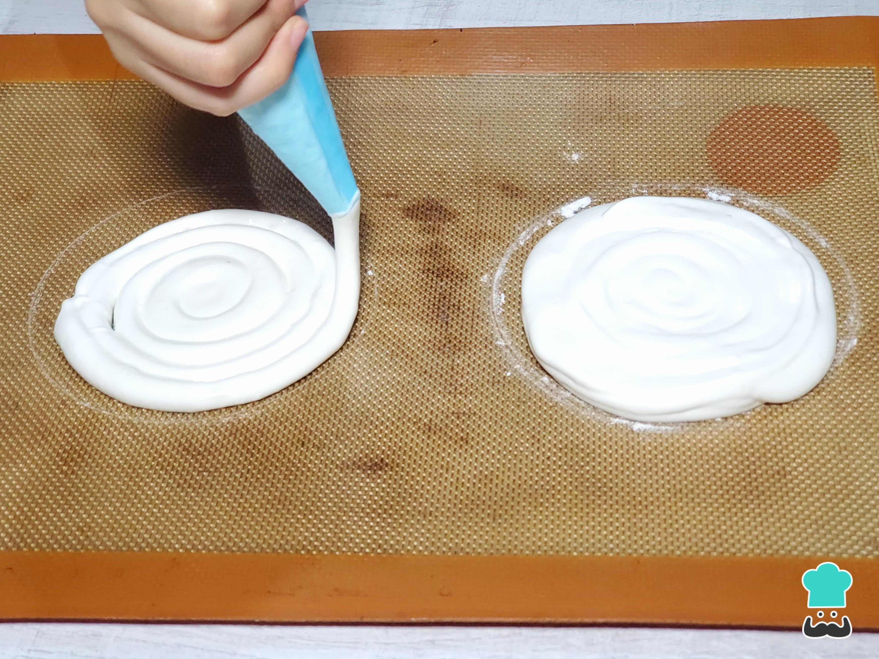 Cuando el merengue esté listo, colócalo en una manga y forma los discos sobre una placa con tapete de silicona o papel manteca. Si no quedan perfectamente lisos, puedes alisarlos con una espátula de codo.
