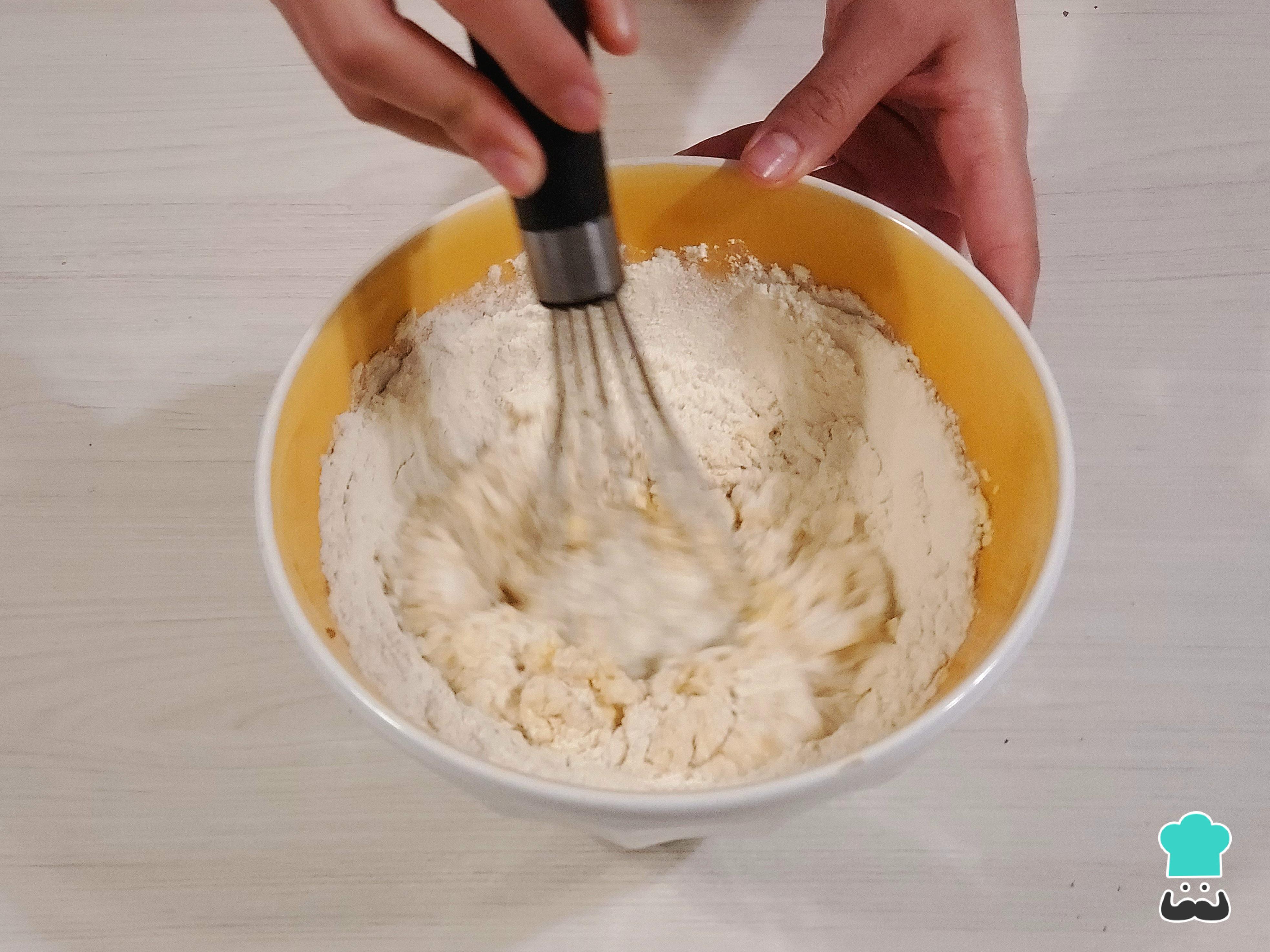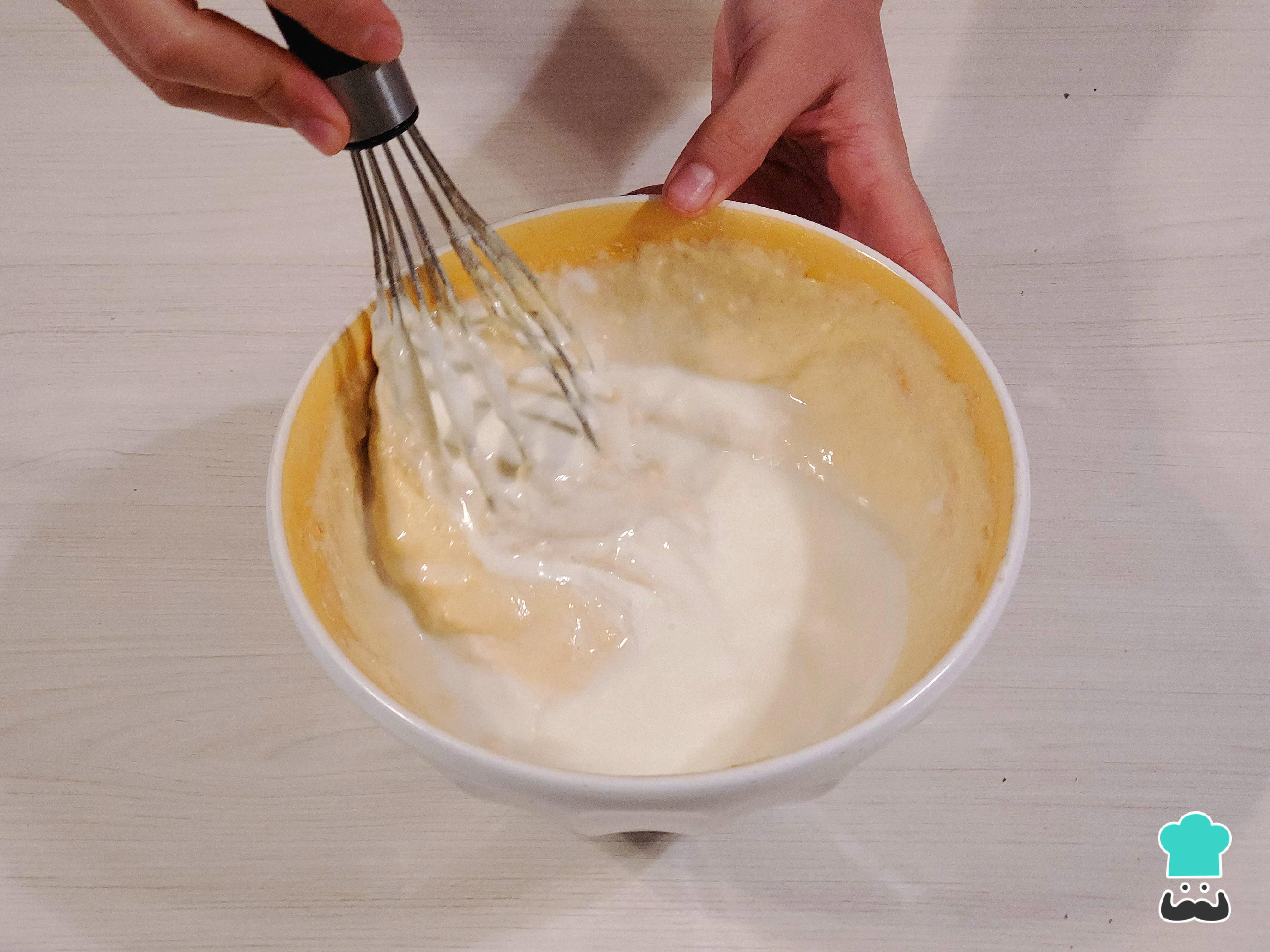 Vierte el resto de harina o de ingredientes secos y remueve bien utilizando el batidor de globo.