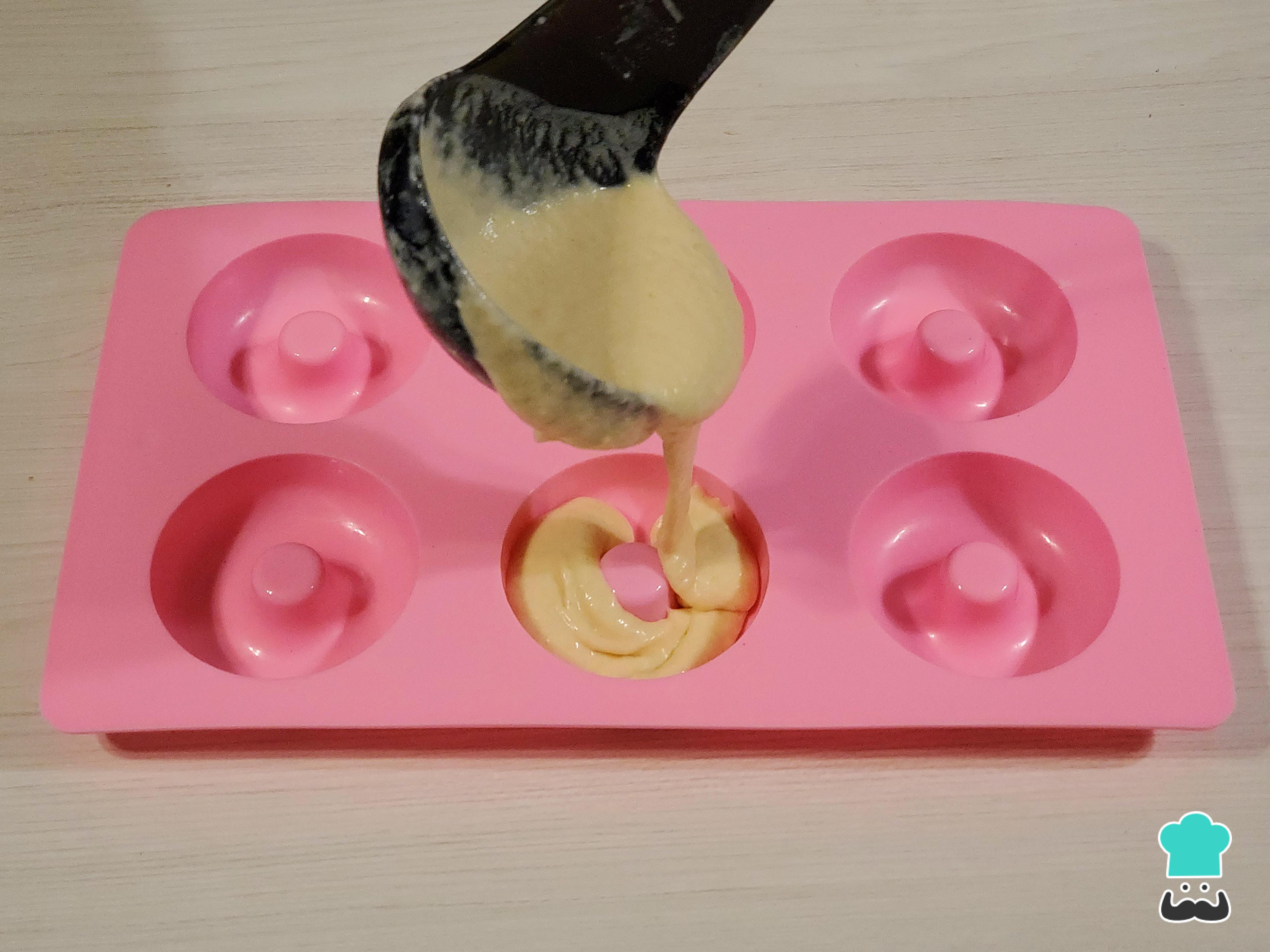 Calienta la máquina de minidonuts o engrasa un molde apto para el horno con forma de aros. Ahí vierte la masa hasta que llene las tres cuartas partes. Cierra la máquina o coloca el molde y hornea a 180 °C por 8 minutos o hasta que las donas se vean doradas. Retíralas inmediatamente de la máquina o del molde y resérvalas sobre una rejilla.