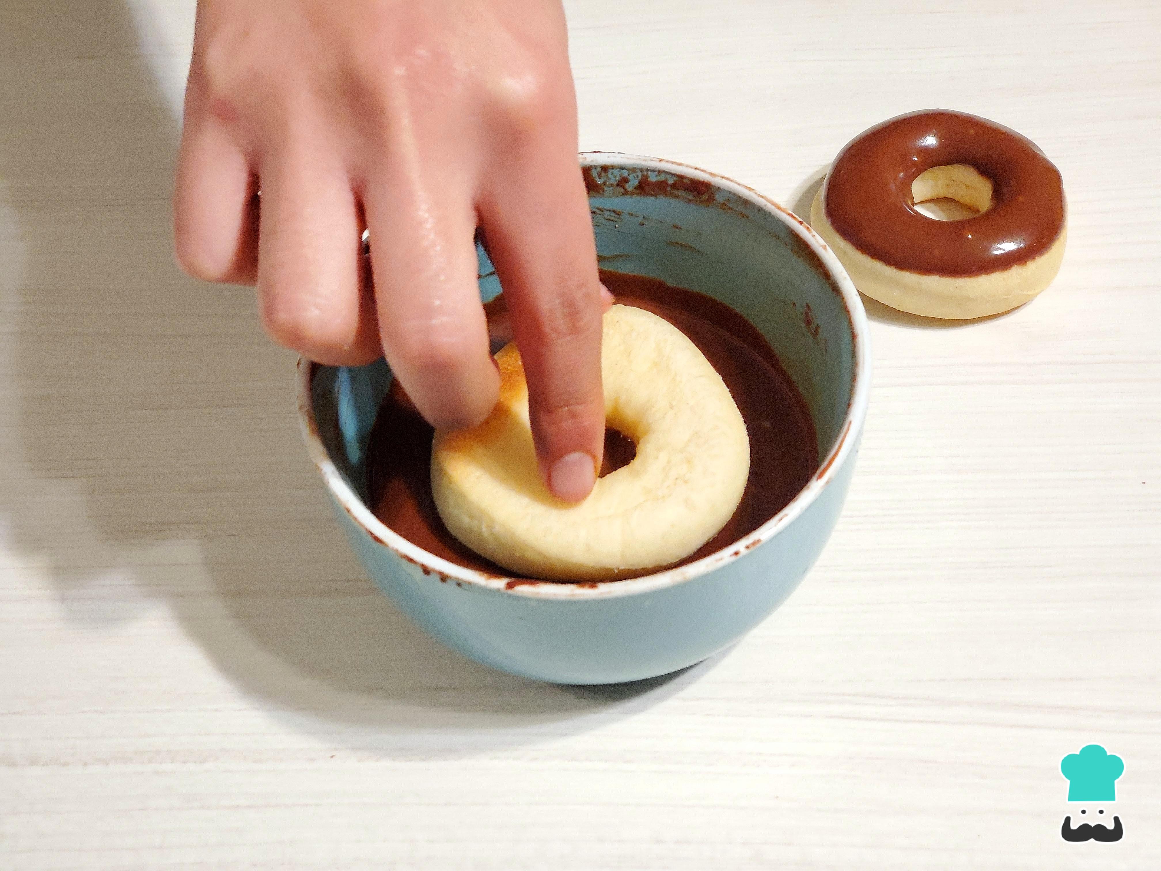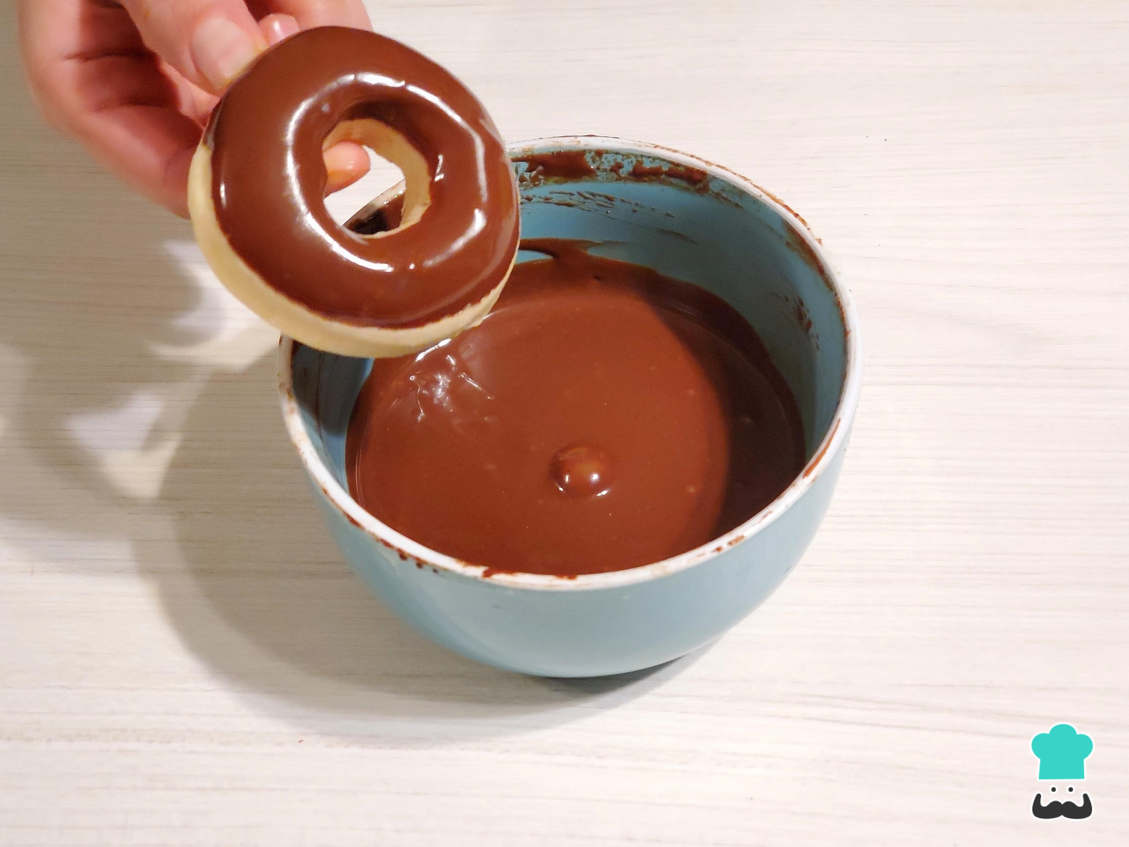 Cuando la ganache esté muy bien emulsionada, vuélcala en un bowl amplio y empieza sumergir mitad de las donas o cubre solo una cara con esta preparación.