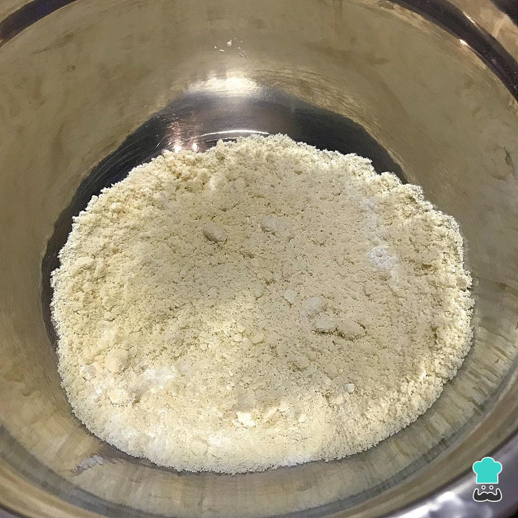 En un bol mezclamos los ingredientes secos: la harina de almendra, la harina de tapioca, la sal y el polvo de hornear. Esta es la base de nuestras donas al horno sin gluten.