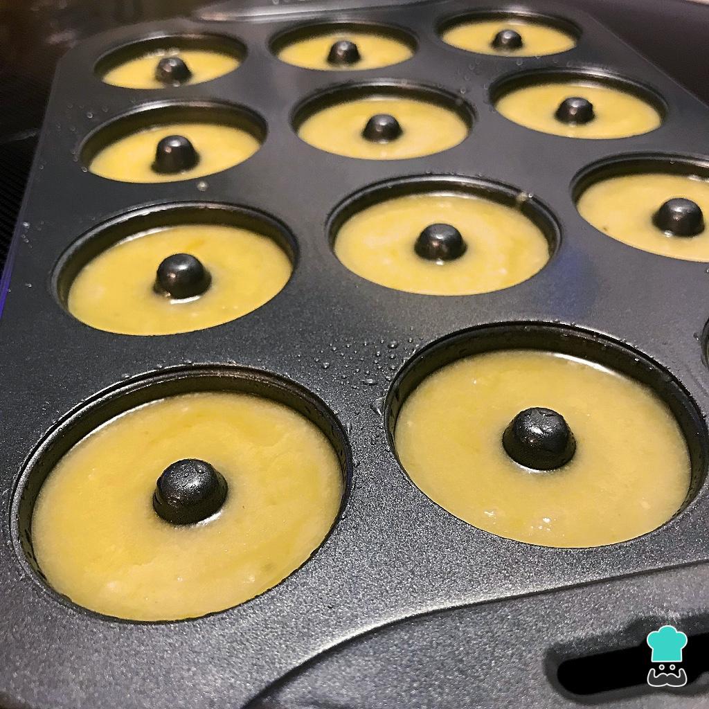 Con la ayuda de una manga pastelera rellenamos los moldes para donas caseras (untado con aceite de coco) con la masa. Los metemos en el horno previamente precalentado a 190 °C durante 12 minutos.