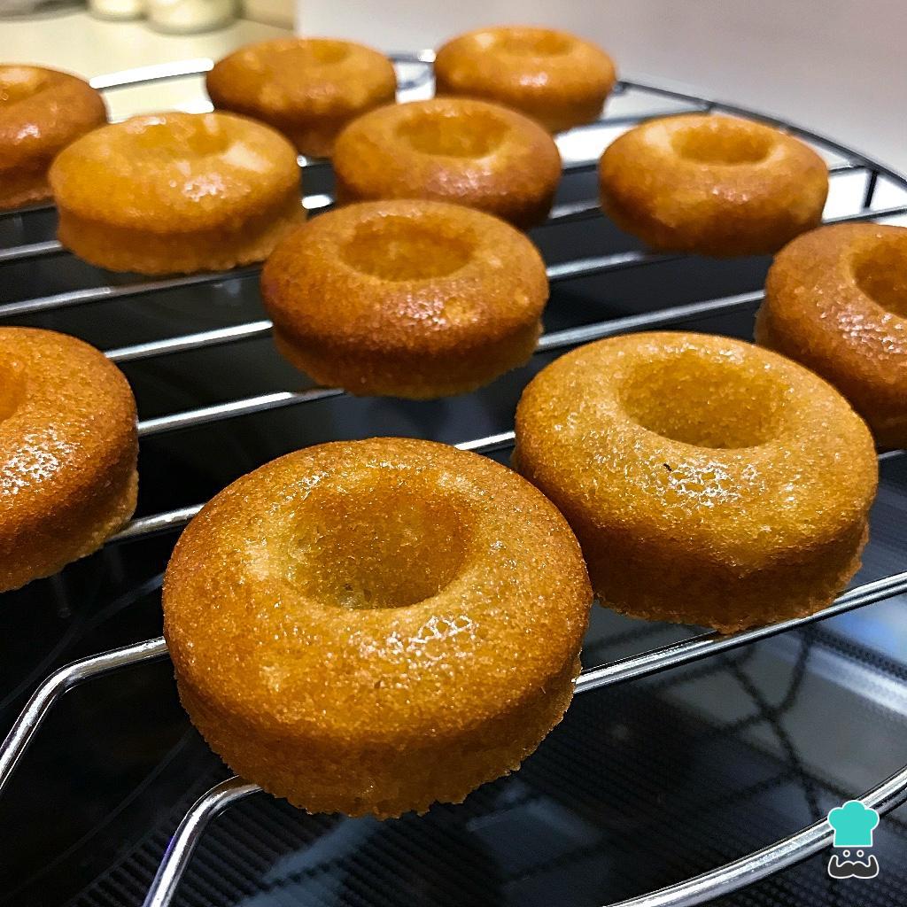 Sacamos la bandeja con los moldes y esperamos 5 minutos antes de desmoldar los donas horneadas sin gluten recién hechas para que se enfríen sobre una rejilla.