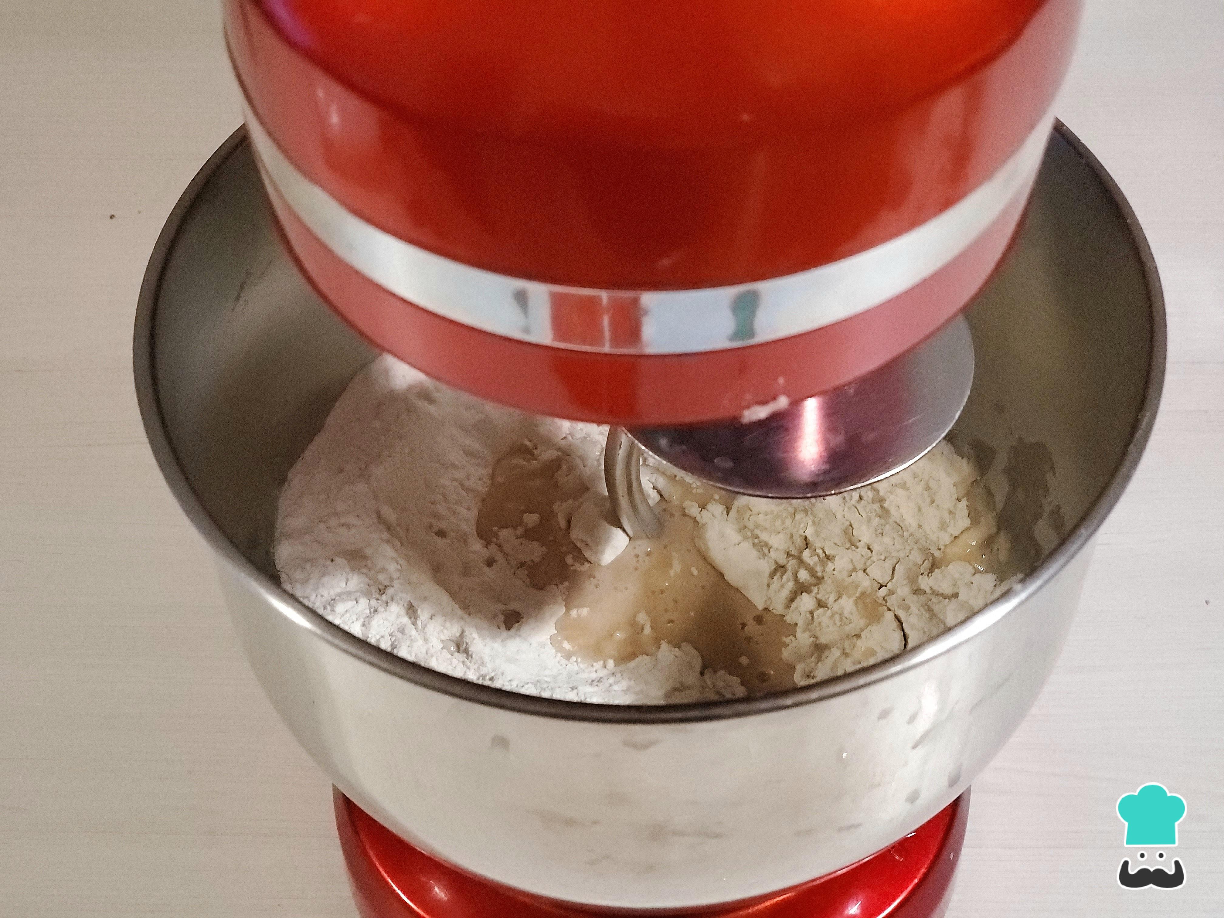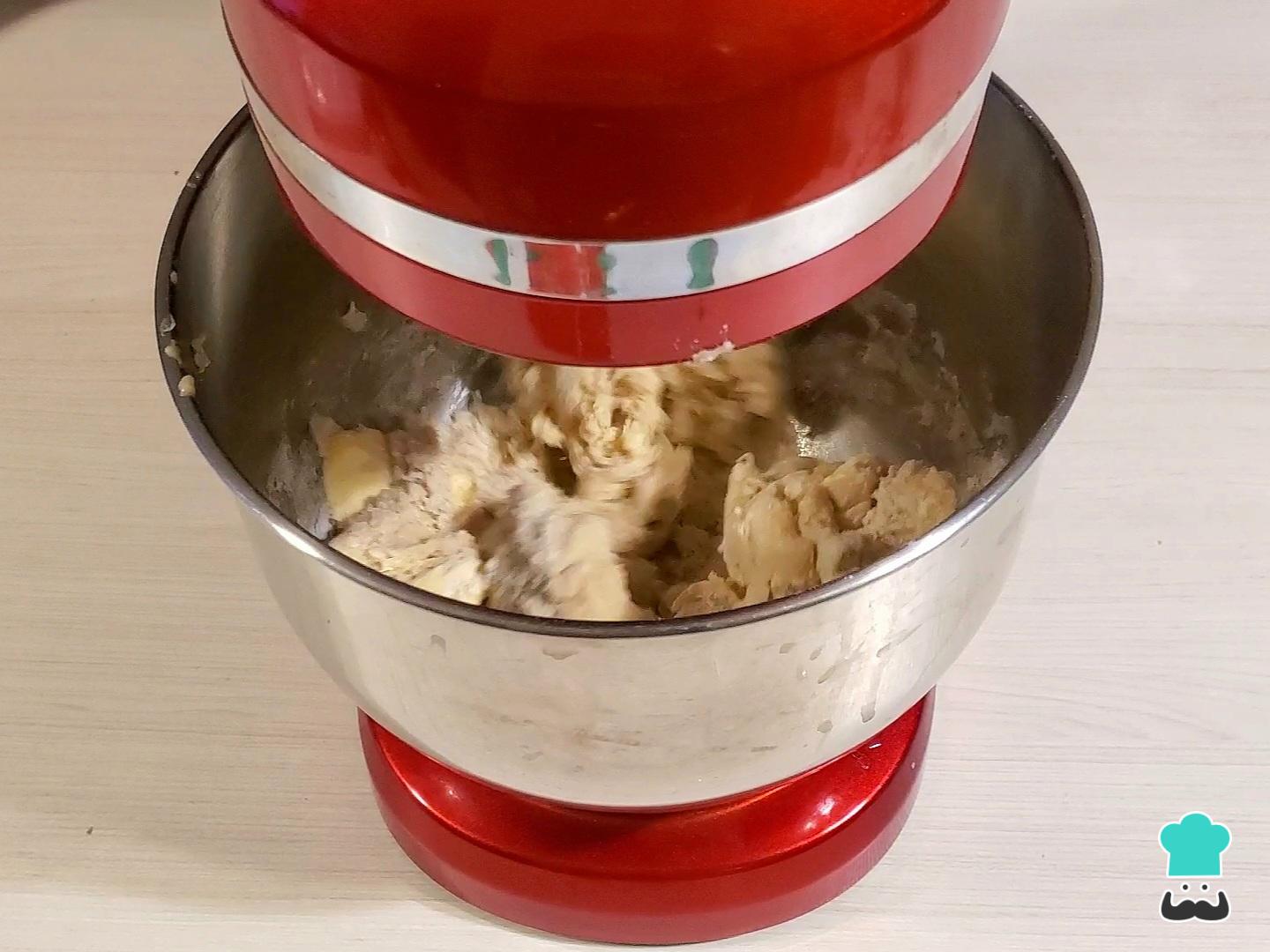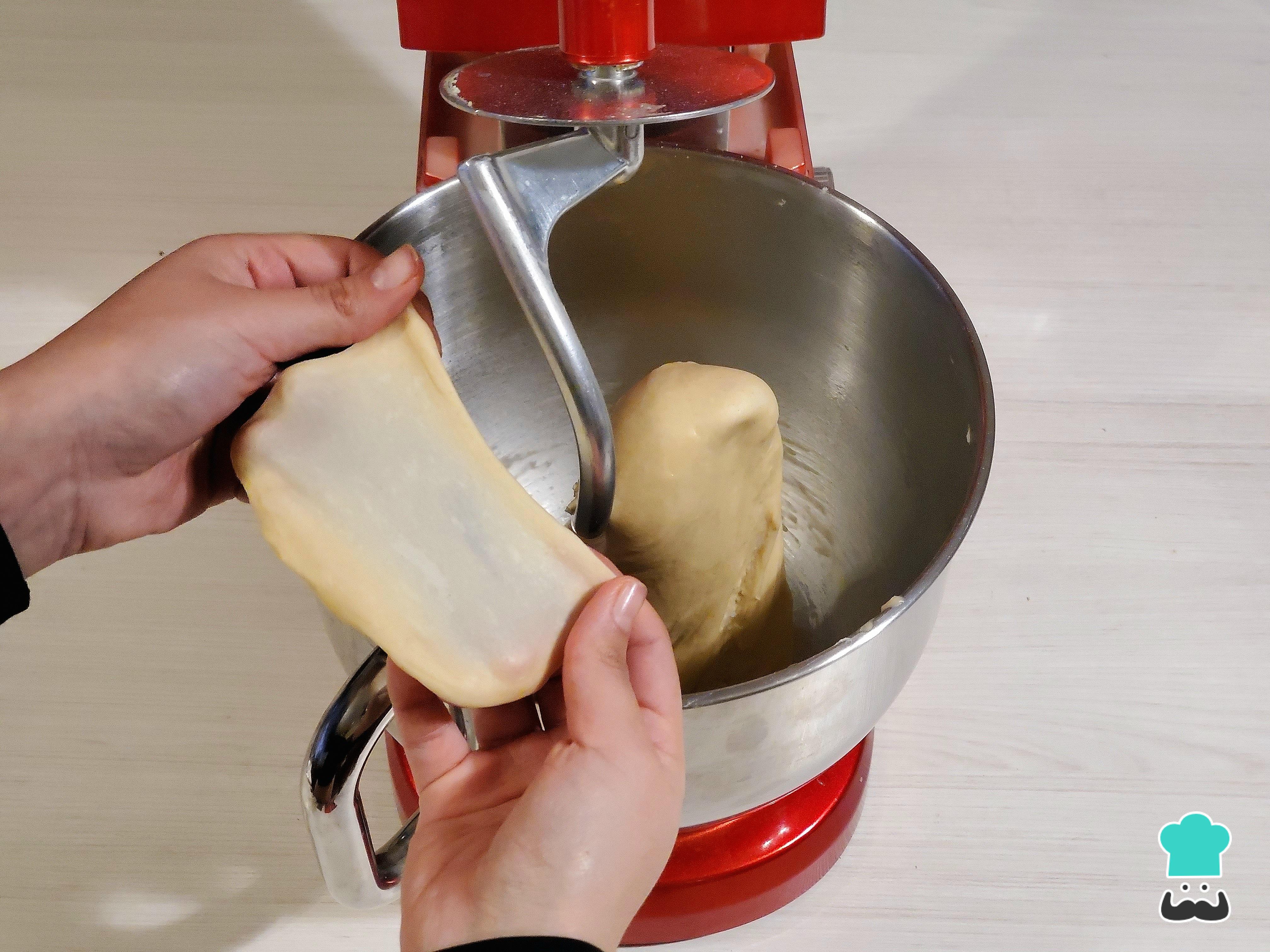 Amasa a máxima velocidad y deja que el gluten se desarrolle, esto puede tomar alrededor de 10 minutos. Para comprobar que la masa está lista, retira un poco, estírala suavemente, debe verse en el centro una película fina sin romperse fácilmente.