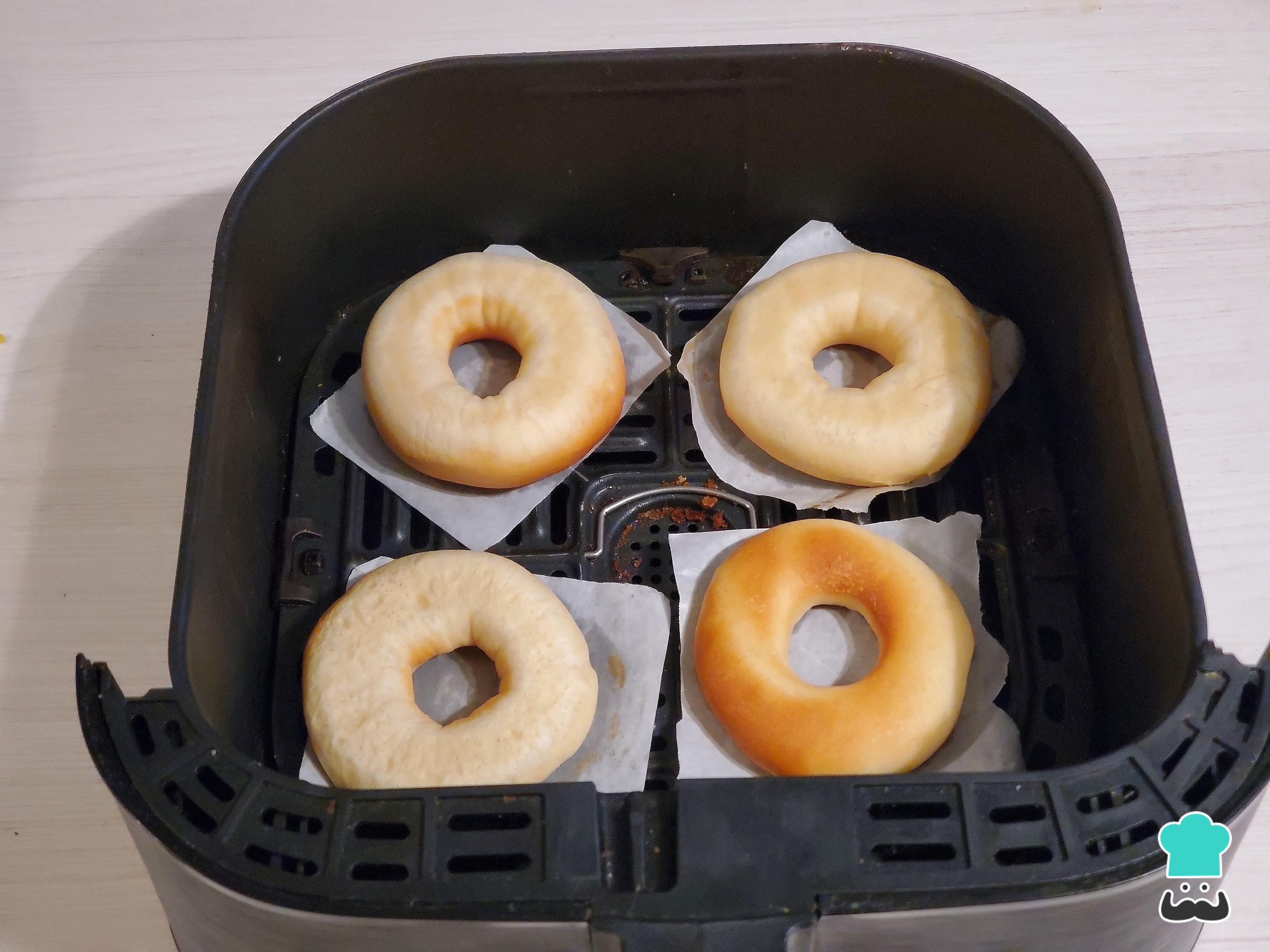 Finalmente, coloca cuidosamente las donas con su papel manteca en la freidora de aire y cocínalas a 180 °C por 3 minutos. Si notas que la base está muy blanca, puedes darles vuelta para que se doren uniformemente.