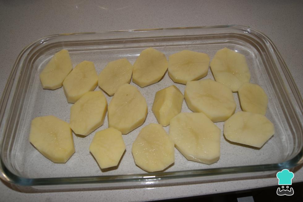 Pela y corta las patatas en rodajas de unos dos centímetros de espesor. Colocalas en el molde para el horno.